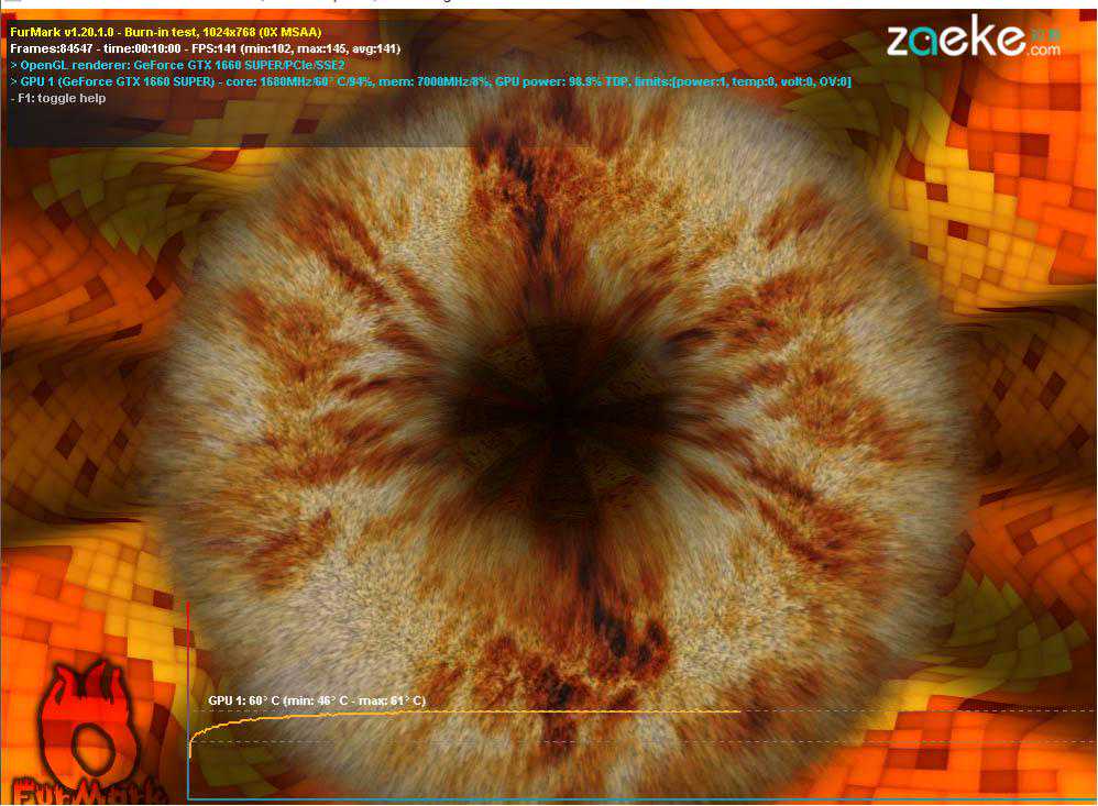 我们在默认风扇转速下用Furmark做了一次拷机测试,测试时间10分钟。室温24℃,显卡核心温度在前三分钟就基本稳定,最高为60℃。考虑索泰那个非常偏向于静音设定的风扇转速设定,我们觉得如此的温控水平非常让人满意。毕竟这张卡在默认的风扇转速设定下噪音非常低,在装入机箱之后几乎可以忽略。