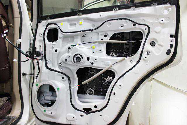 撕掉防水膜把门板的里层清洁干净,贴上我们的第一层止震板。第一层止震板能够有效的抑制车在路上行驶时车的车门铁皮带来的震动及风噪。