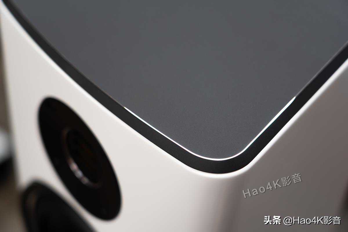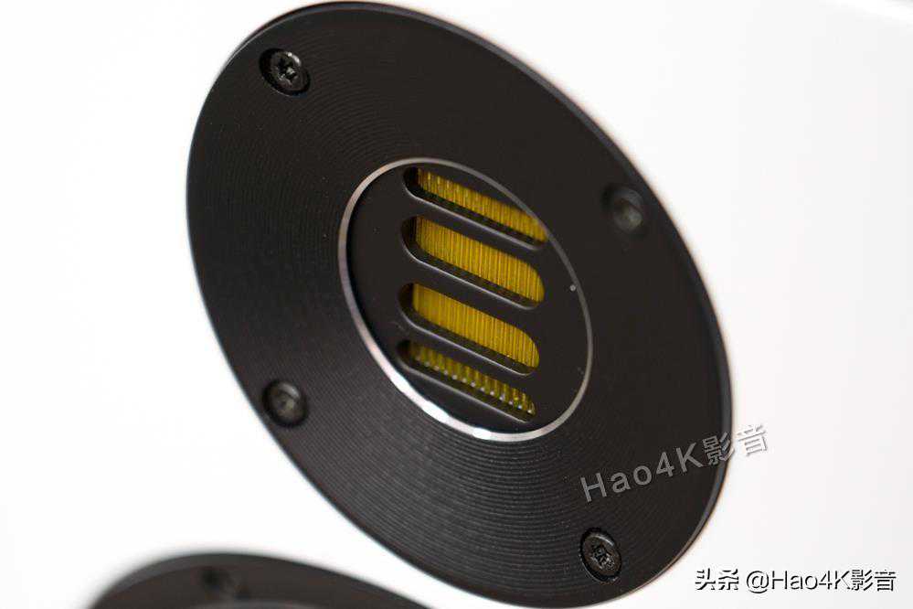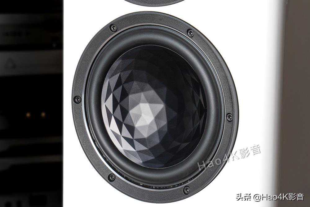 在高音单体下方,则是两只180mm的ASXR水晶振膜低音。这个水晶振膜单体也是Elac的招牌菜,AS是AluminumSandwich的缩写,就是铝质三明治振膜,而XR则表示ExtedRange,指在频率响应上有所提升。Elac为了追求更低的失真,因此选用刚性高的铝合金做振膜材料,可是,他们为了降低振膜本身的谐振,以减少失真,他们通过复合材料、涂料,和几何挤压成形,在振膜上制造出状似水晶表面的立体纹路,进而提高了振膜自身的刚性和阻尼,有助于降低谐振和失真。VelaFS408的两颗低音,上面那颗与高音衔接,负责2550Hz以下的全部频段,而下面那颗低音则为补强低音,仅在450Hz以下频段发声,与JET5构成2.5音路。