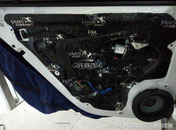 车门隔音采用的是大白鲨止震板,止震板的主要作用是将车门密封成箱体,为喇叭提供一个更好的工作环境。