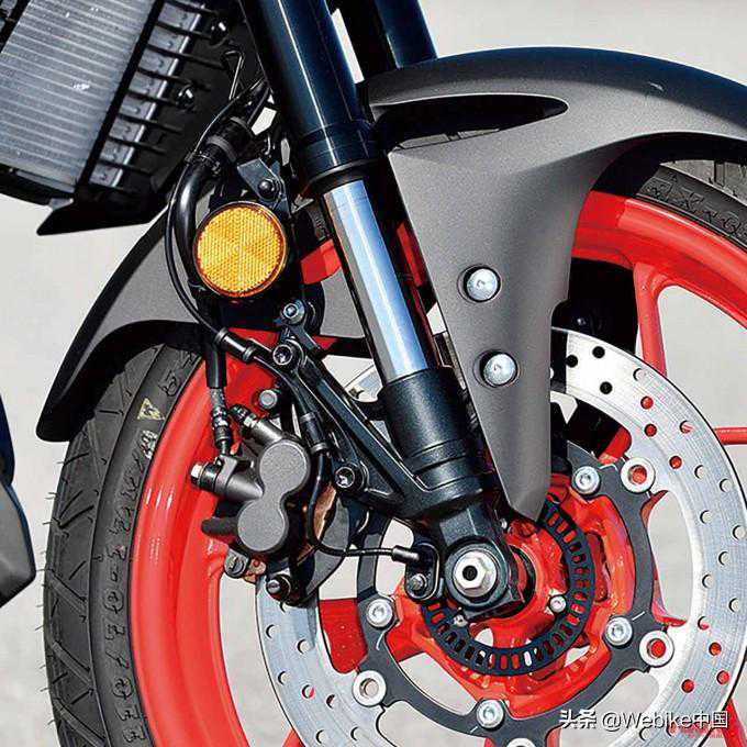 ▲前避震器从φ41mm正立式变更为φ37mm倒立式,单向双华塞卡钳搭配单碟盘设定则没有改变,仅忻增加了ABS系统,标准配胎是IRC/RX-01。
