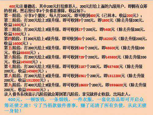 但他们又在怎样去尽可能多的收割"老哥"们呢?答案很简单--传销式推广。如果用户的负债金额有600元,在第一阶段收到600元的众筹款时,用户的众筹计划直接结束,系统不会再分配用户收取众筹款;如果用户的负债金额有2400元,到第二阶段众筹计划直接结束,以此类推,最高到第九阶段共计可以众筹到近400万。