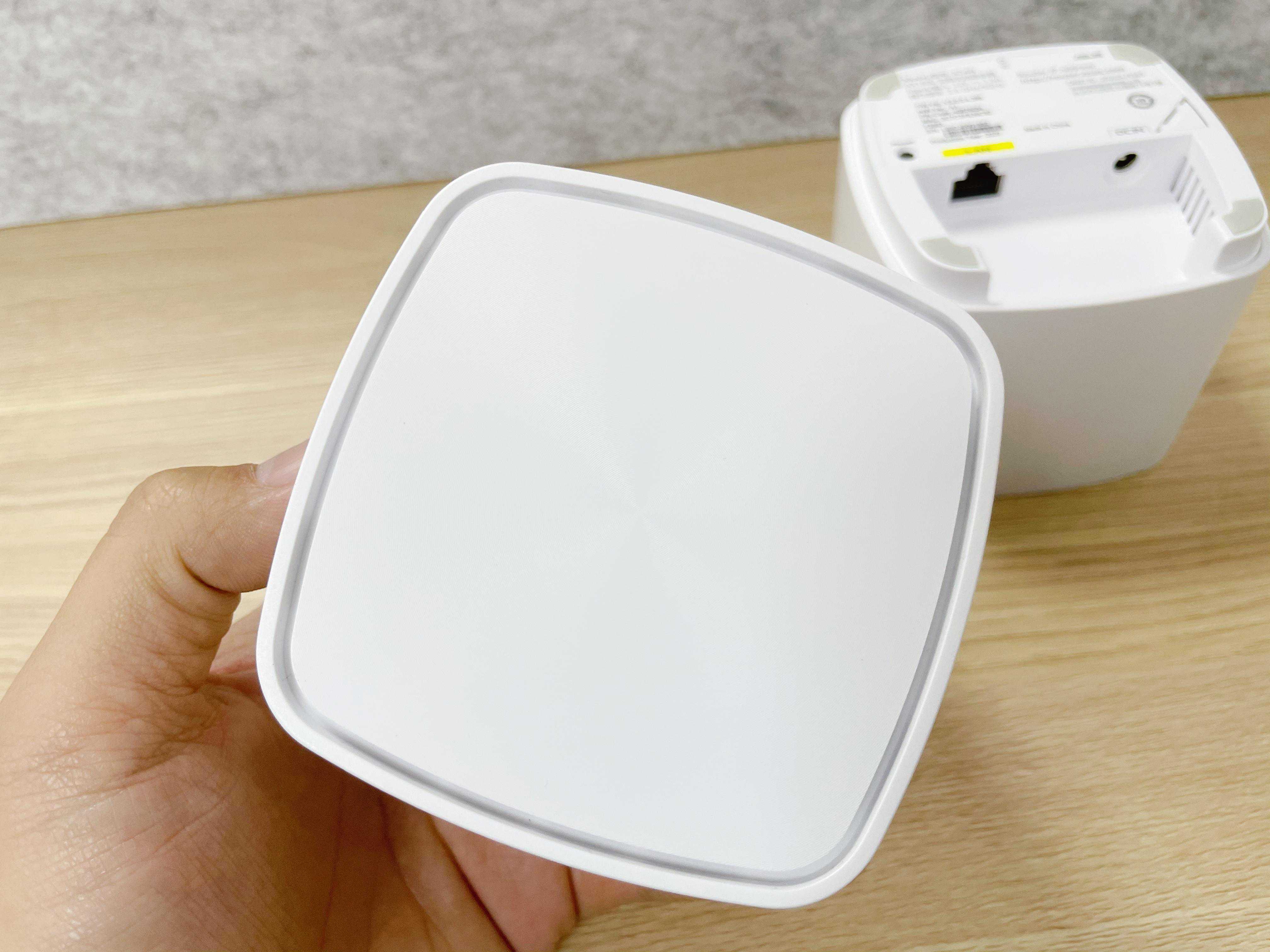 从底部就能区分哪个是主路由器哪个是节点路由器。主路由器在接口上多一个千兆WAN口,还有个千兆LAN口以及电源接口,而节点路由器只有千兆LAN口和电源接口。另外两台路由器上都有黑色reset键。在路由器底部留有一定高度的缺口,方便排线还不影响路由器的美观。