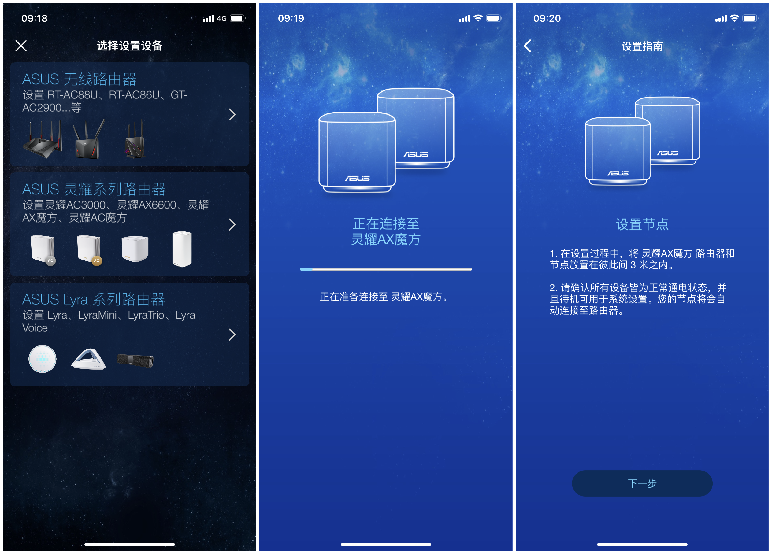 由于3楼电脑处网线接口是损坏的,两台路由器只能在2楼安装调试完成之后把节点路由器放在3楼使用。没有电脑就在手机上完成对华硕灵耀AX魔方的设置。首先下载ASUSRouterAPP,选择需要设置的设备,然后就是根据提示进行连接华硕灵耀AX魔方,同时也会直接设置节点路由器,无需二次操作。