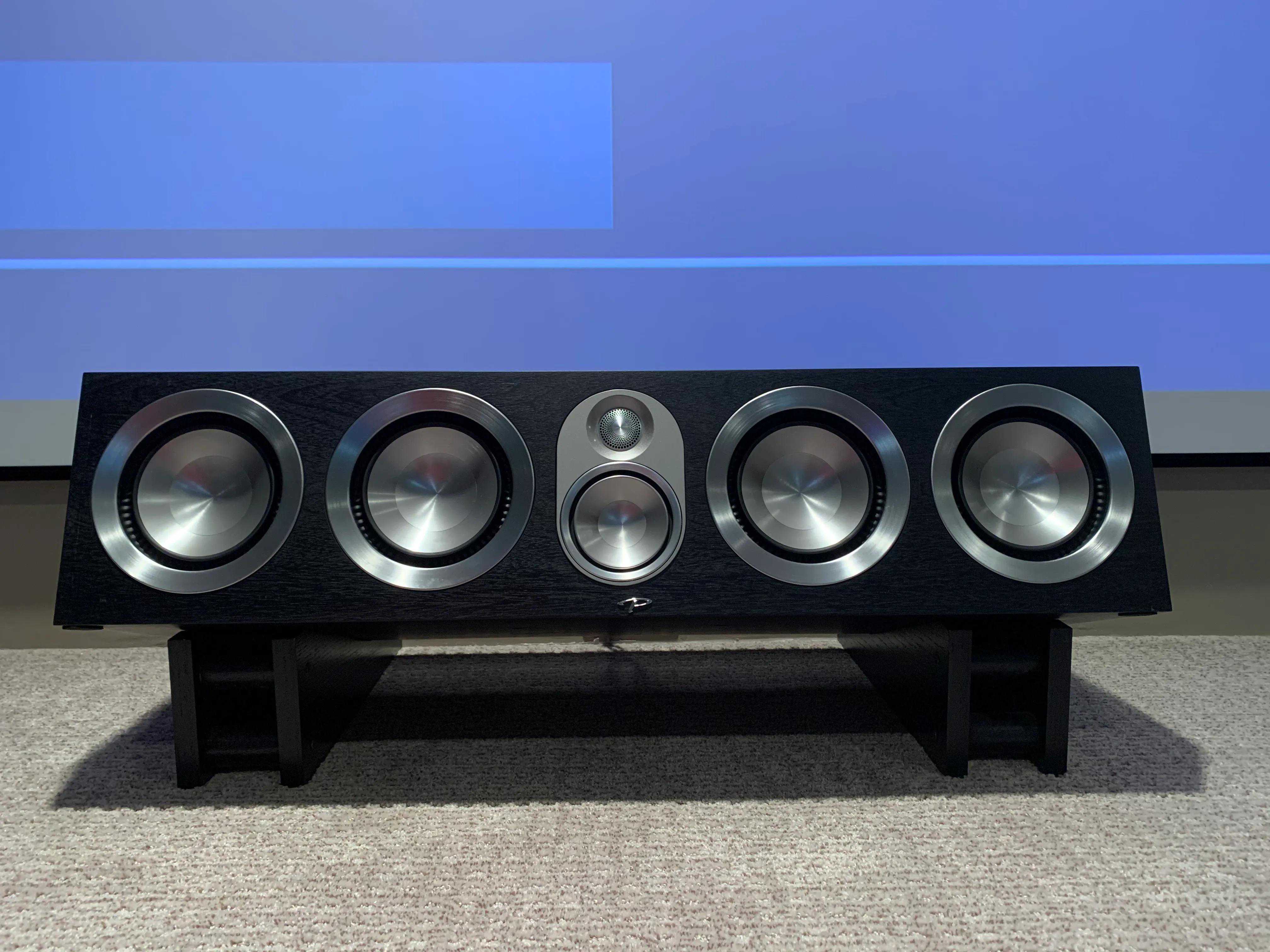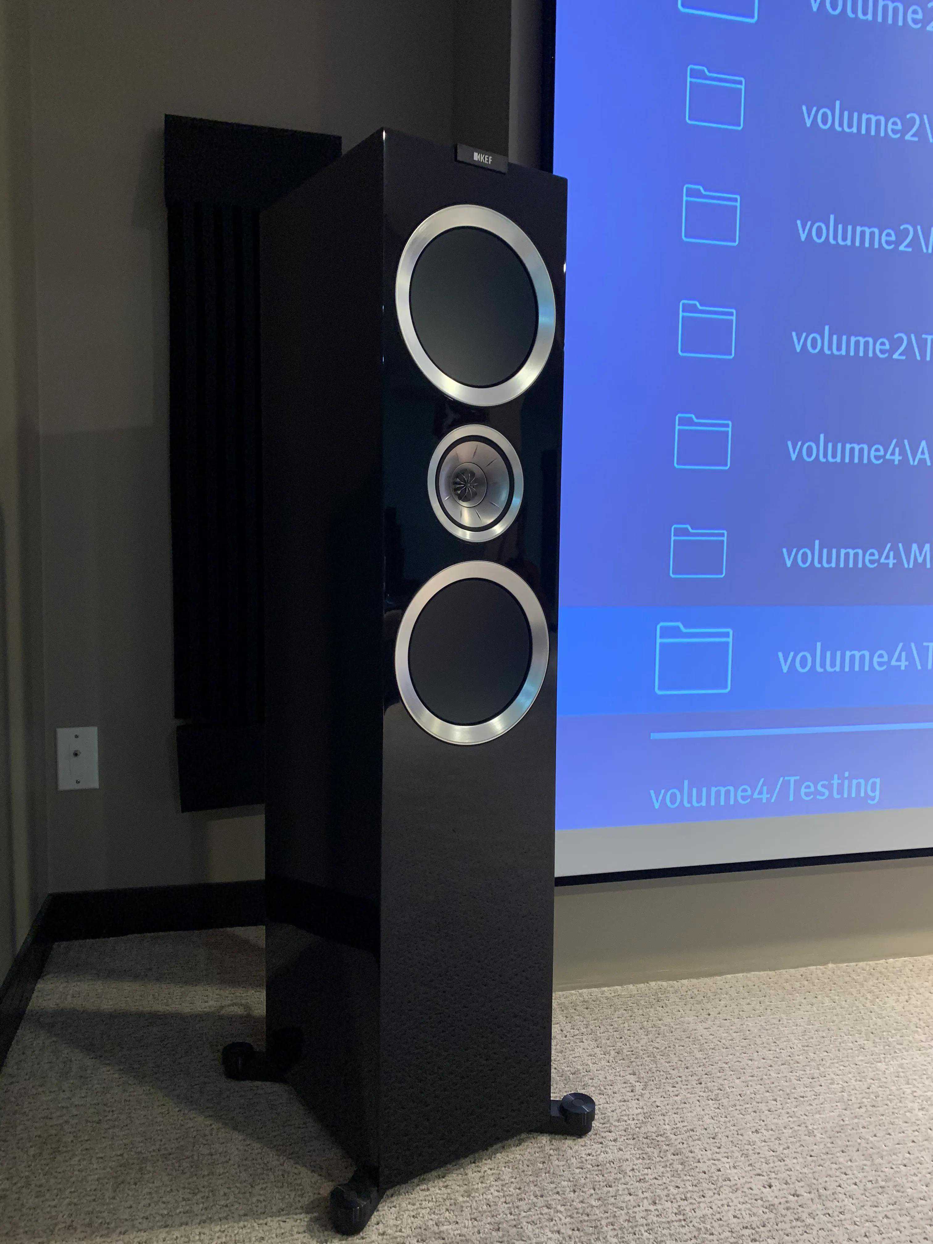 两个前置KEFR系列是我最喜欢的设计,黑色钢琴漆配铝膜单元特别养眼。两个八寸低音单元,一个五寸中音和一寸高音搭配的同轴单元。