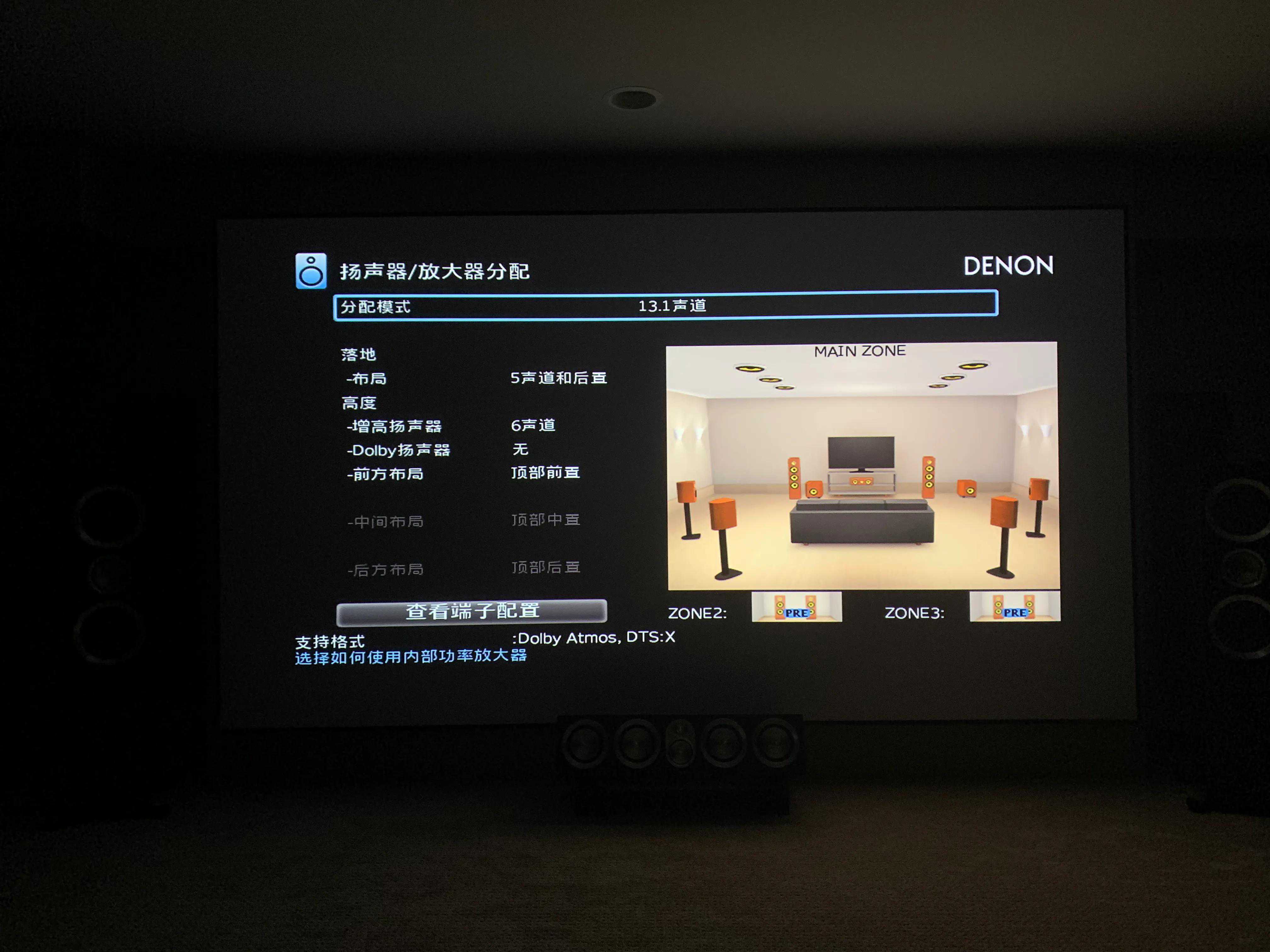 这是13.1声道音箱的布局,支持杜比全景声和DTS:X,影音效果呢,虽然比不上国内影院群里的大烧们,但在我们这个村里难逢对手,我自己还是比较满意的。