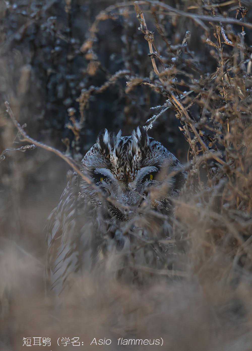 图片描述:在一个下雪的早晨,我开车来到湿地寻找心中鸟,开车转悠很久,心中的它一直没有出现,雪一直下,天越来越冷,正当我停车准备收拾设备回家的时候,抬头看见前方不远处有一堆草丛,我习惯性拿出望远镜看过去,立刻我就热血沸腾了,终于看见心中的它正静静地趴在草丛里,身上大部分被大雪覆盖着,其他部位又和草丛十分靠色,雕鸮与生俱来的保护色大大增强了它的安全系数。只要它不动,一般人还真很难发现它的存在。我怀着忐忑的心情慢慢把车开近一点,逐渐靠近、在我估计的安全距离选好角度停车打开窗户,拿出相机激动地按下快门记录它身影。