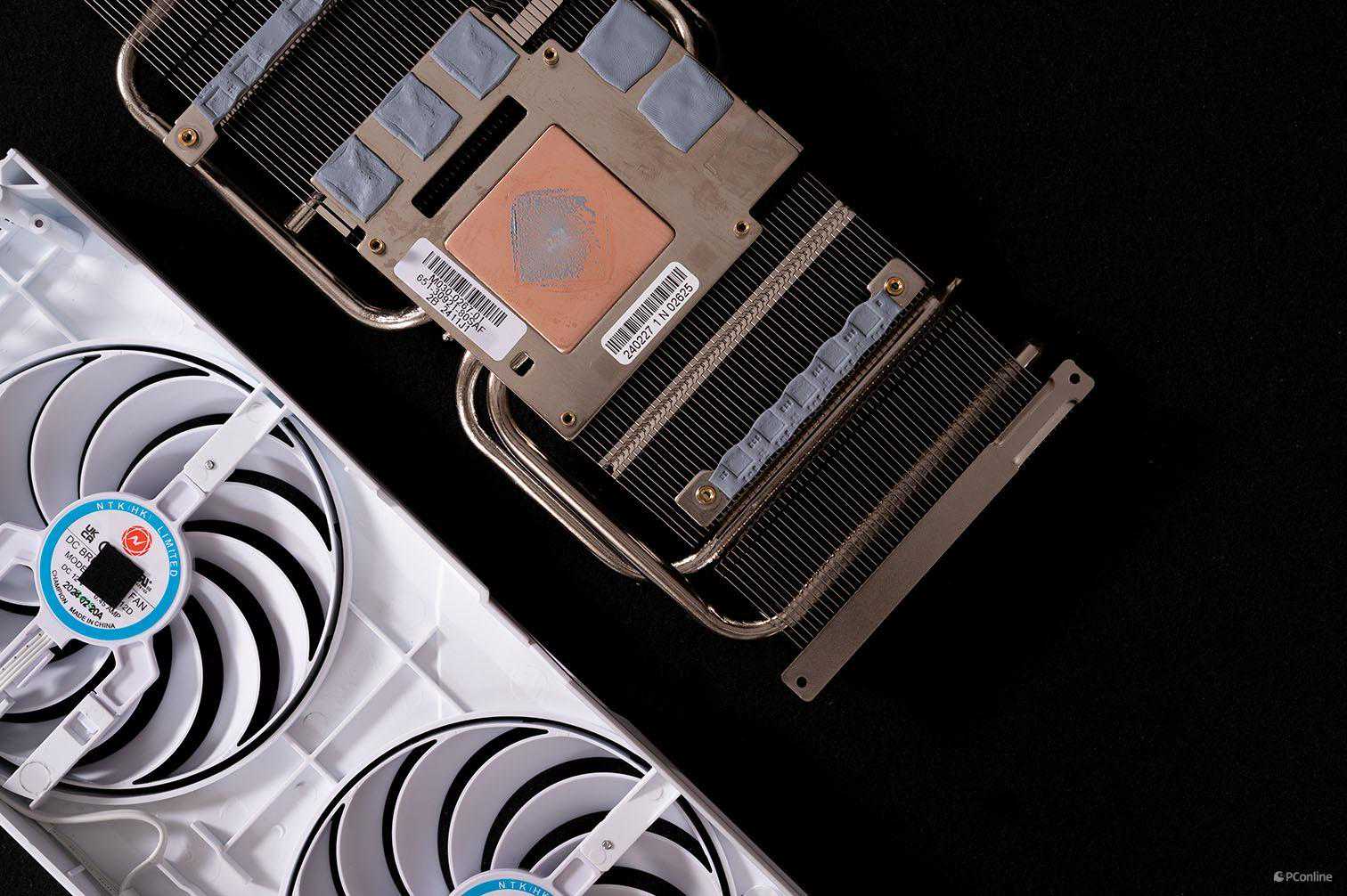 再来看看这款显卡的散热系统,不得不说这款显卡的散热堆料是真的足!像显存、电感部分都覆盖了高导热系数的导热垫,核心处的硅脂也是厚厚的一层。