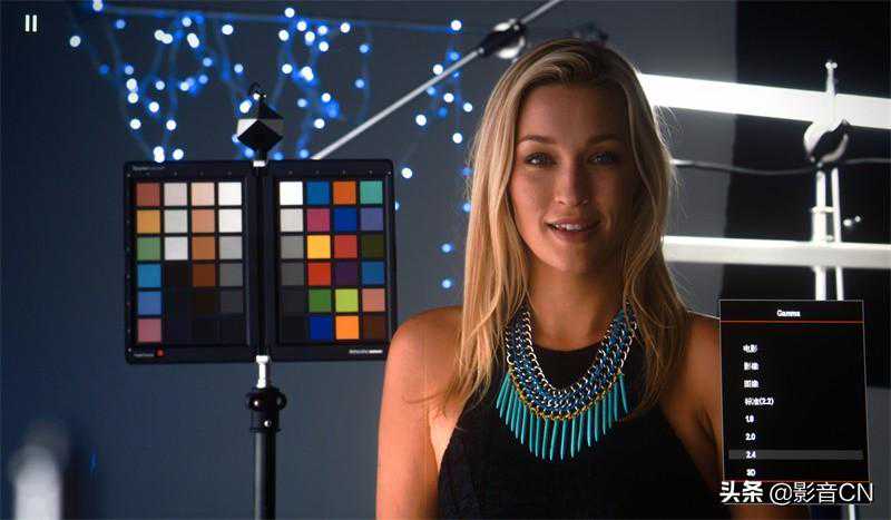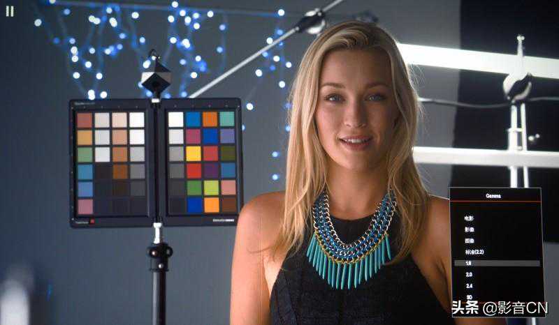 为了检验默认的HDR显示模式的色彩表现,我们简单调了一下锐度,亮度和对比度保持不动,伽马选择标准2.2,色温默认D65,色域以看起来比较自然适中的“影院”为准,“HDR显示模式”选择最亮的“明亮”模式,并且完全不动两段式的灰阶白平衡调整功能与6色色彩管理系统,以下是现场屏摄。