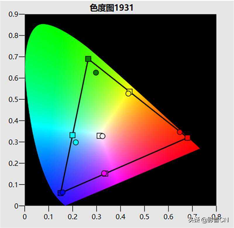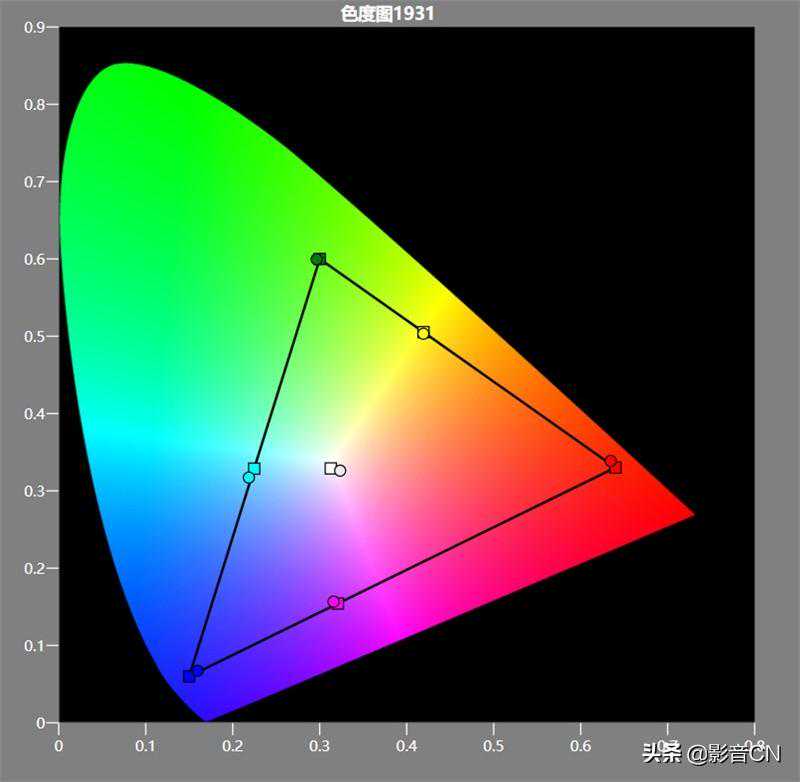 在CIE1931色度图上,可以看到经过调校后的4KHDR色域范围基本接近80%的DCI-P3标准
