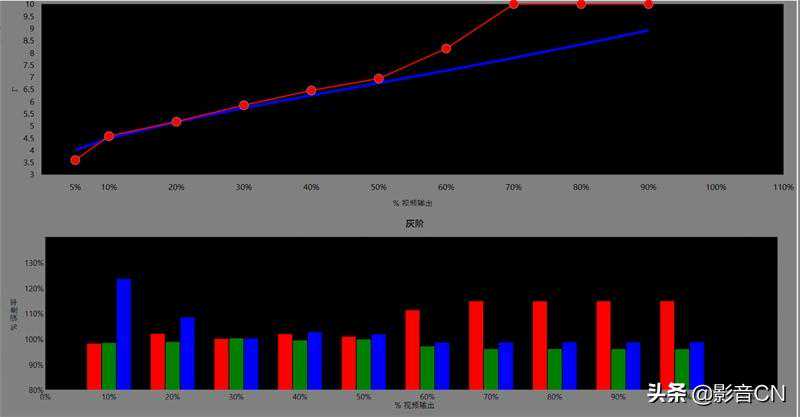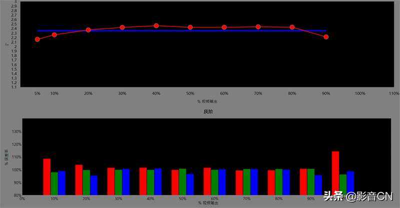调整后,可以看到4KSDR状态下20%-90%关键部分的灰阶白平衡都维持在相当平稳的状态,而Gamma灰阶过渡方面的起伏也不大,基本可维持在2.35左右的水平