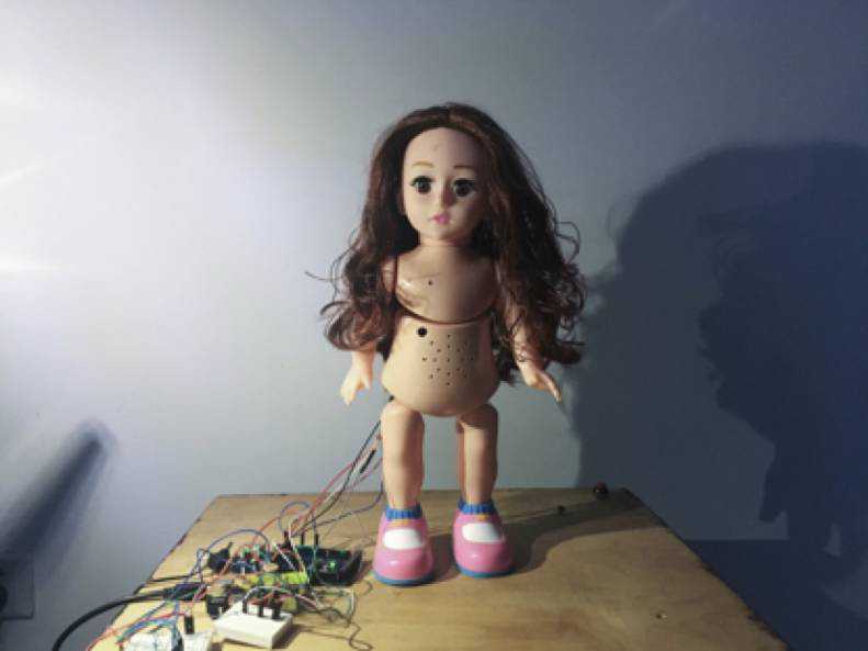 作品灵感来自于人对外物的一种反应,利用电子元件制作,将小红灯放置在娃娃头部,通过距离感应器来控制灯的亮暗和声音振动的频率。当人越走近时灯会越亮,声音也会越尖锐。表现的是面对陌生人的一种情绪或是生理变化。