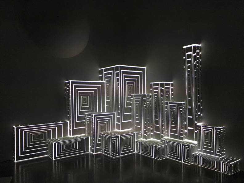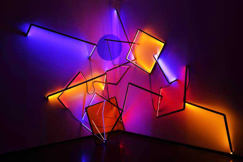 Unstablestructureofthoseabandonedpictureframesandth,withgeometry,colors,spaceandtrichromaticlampsasamediuminsteadofpigment,,exploringanewfancifulspaceunderthetransformationofconsciousness.