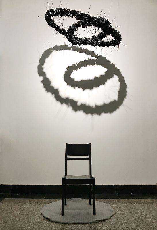 作品简介/BriefIntroduction:黑色的花是由背心塑料袋被撕扯后留下的最上面的部分组成的,也是最被忽视、最无用的部分,长久地被如此对待,积怨深厚,变成了两个花环。像一团乌云,笼罩在头顶之上。谁也不会一帆风顺,也不会一直受到上帝的眷顾。艺术如此,人生亦如此。