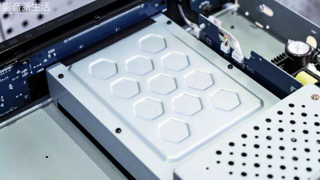 UDP-LX500的内部,更是从配重平衡方向出发,采取中置碟盘的设计,顶板还加入三排六边形的冲压,利用蜂巢形结构巩固光驱刚性。光驱亦以低重心安装,靠近机体底盘,加上有弹性的阻尼材料吸振。值得一提的是,在碟仓门与面板之间也加入了避振弹簧和缓冲材料,延续旧型号BDP-LX88、LX58的“AcousticDamperTray”设计技巧,尽可能消除细微振动。如此用心设计,比不少同级乃至高价位的HiFiCD转盘更加考究。