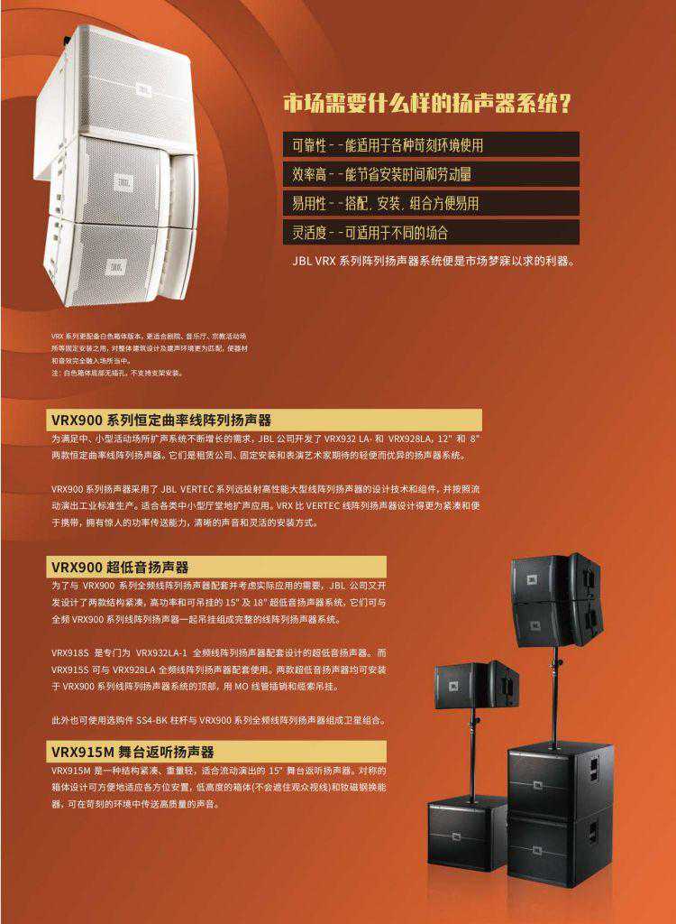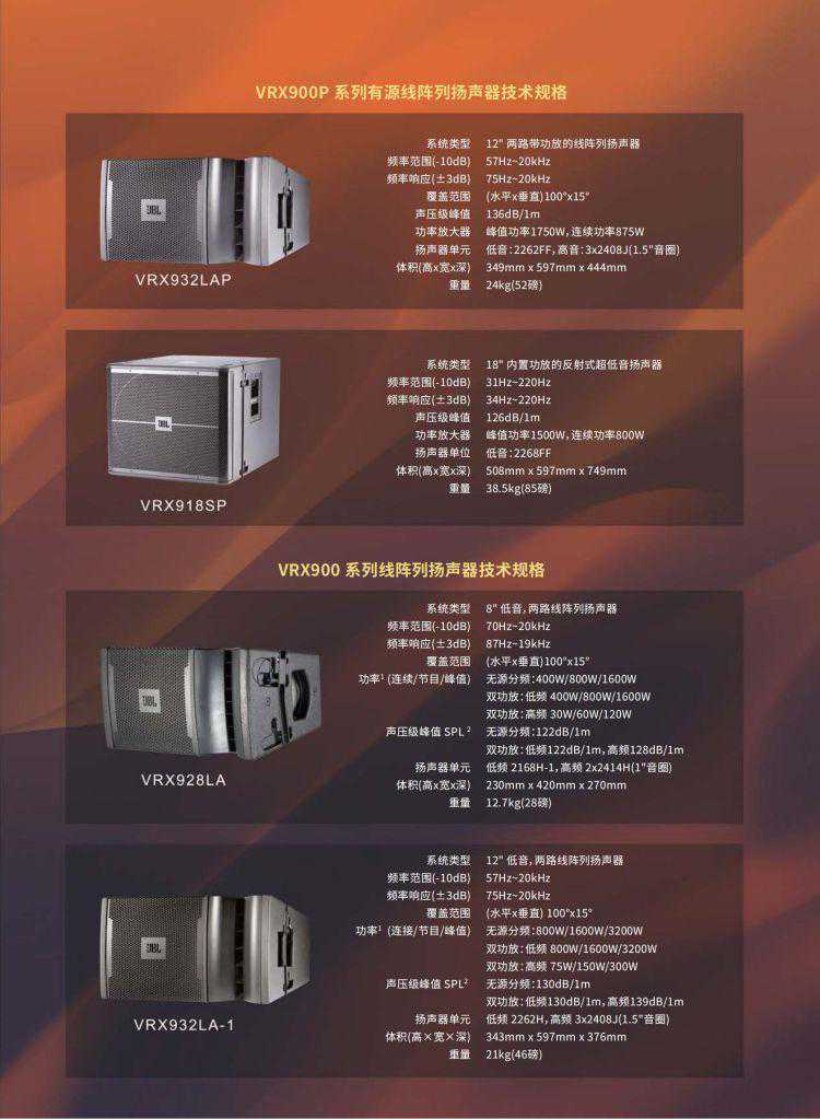VRX900系列扬声器采用了JBL的VERTEC系列远投射高性能大型线阵列扬声器的设计和组件,并按照流动演出工业生产。适合各类中小型厅堂地扩声应用。VRX比VERTEC线阵列扬声器设计得更为紧凑和便于携带,拥有高功率传送能力,清晰的声音和灵活的安装方式。