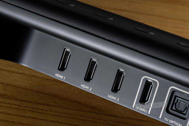 Soundbar背面设有3入1出的HDMI接口,支持ARC功能以及4KHDR图像输入,包括DolbyVision输入及pass-through。
