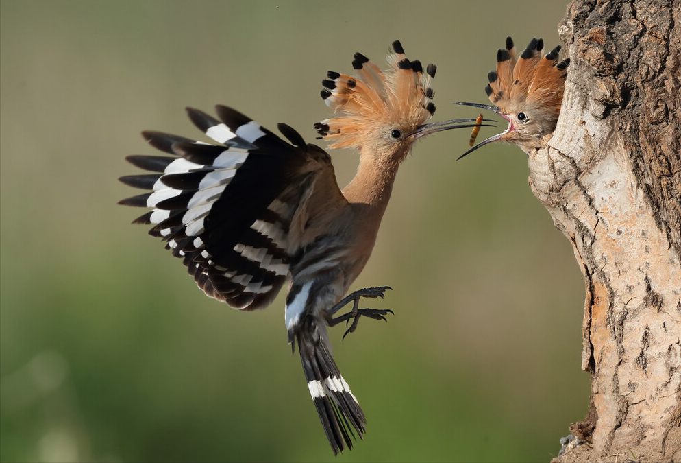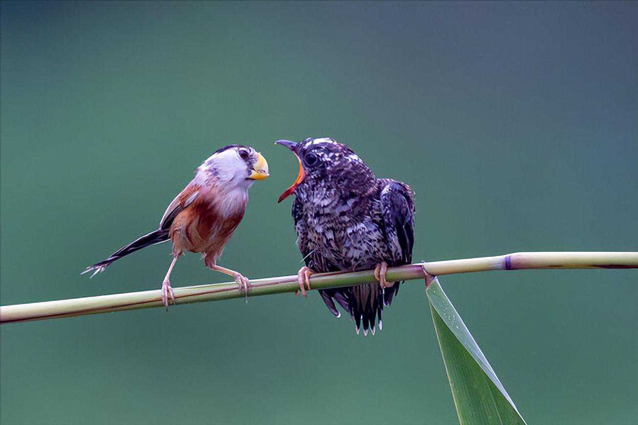 杜鹃类有几种鸟,是典型的流氓鸟,从来不自己做窝,专门抢苇莺、黑卷尾这些鸟的巢穴寄生,孵化后雏鸟将寄主的雏鸟杀死,被寄主喂养至成熟,你看到一只小鸟在喂养一只巨大的鸟时,一定就是这个情况了!