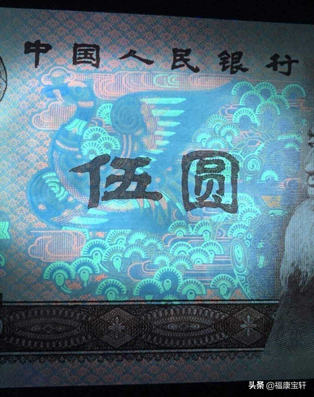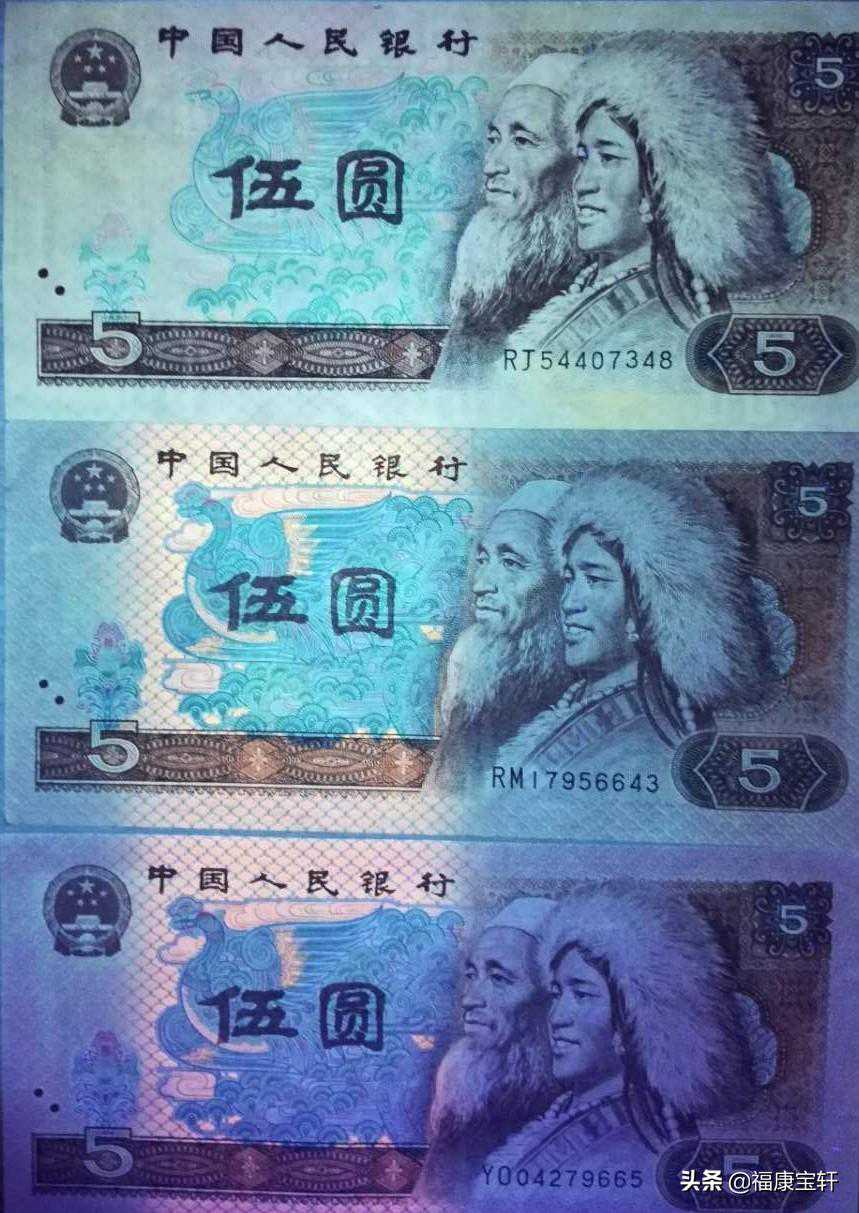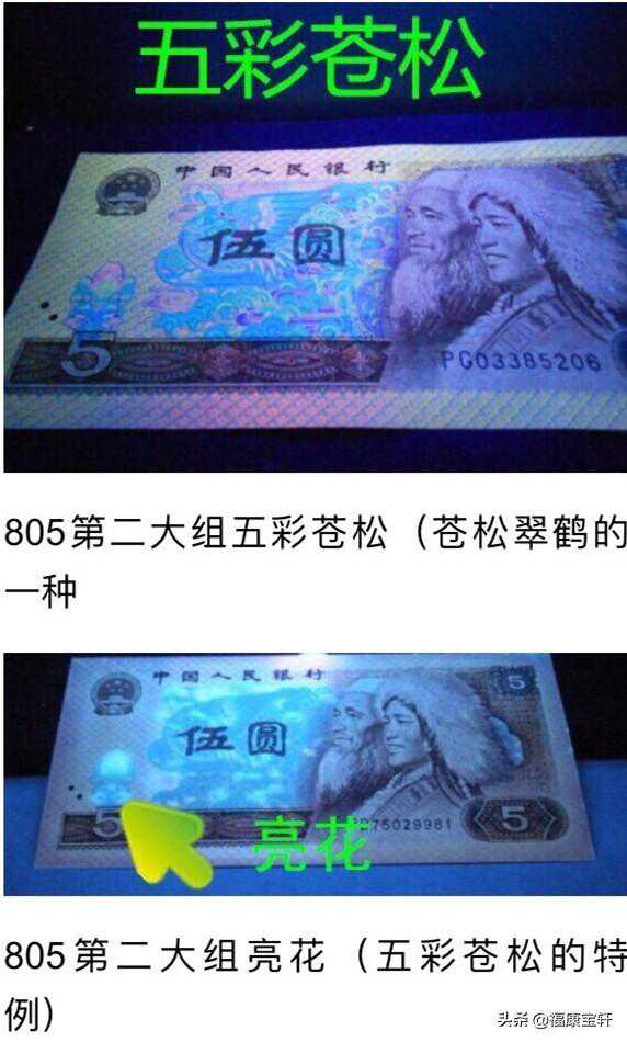 四套人民币中80版伍元(简称:805)究竟有几大荧光?市场上有两种声音。一种声音说有两大荧光:苍松翠鹤、红光蓝鹤。另一种声音说共有三大荧光:苍松翠鹤,五彩苍松,红光蓝鹤。但无论是哪种声音细分都是有六种荧光:绿苍松、五彩苍松、红光蓝鹤、金光蓝鹤、红霞鹤影、金网鹤王。