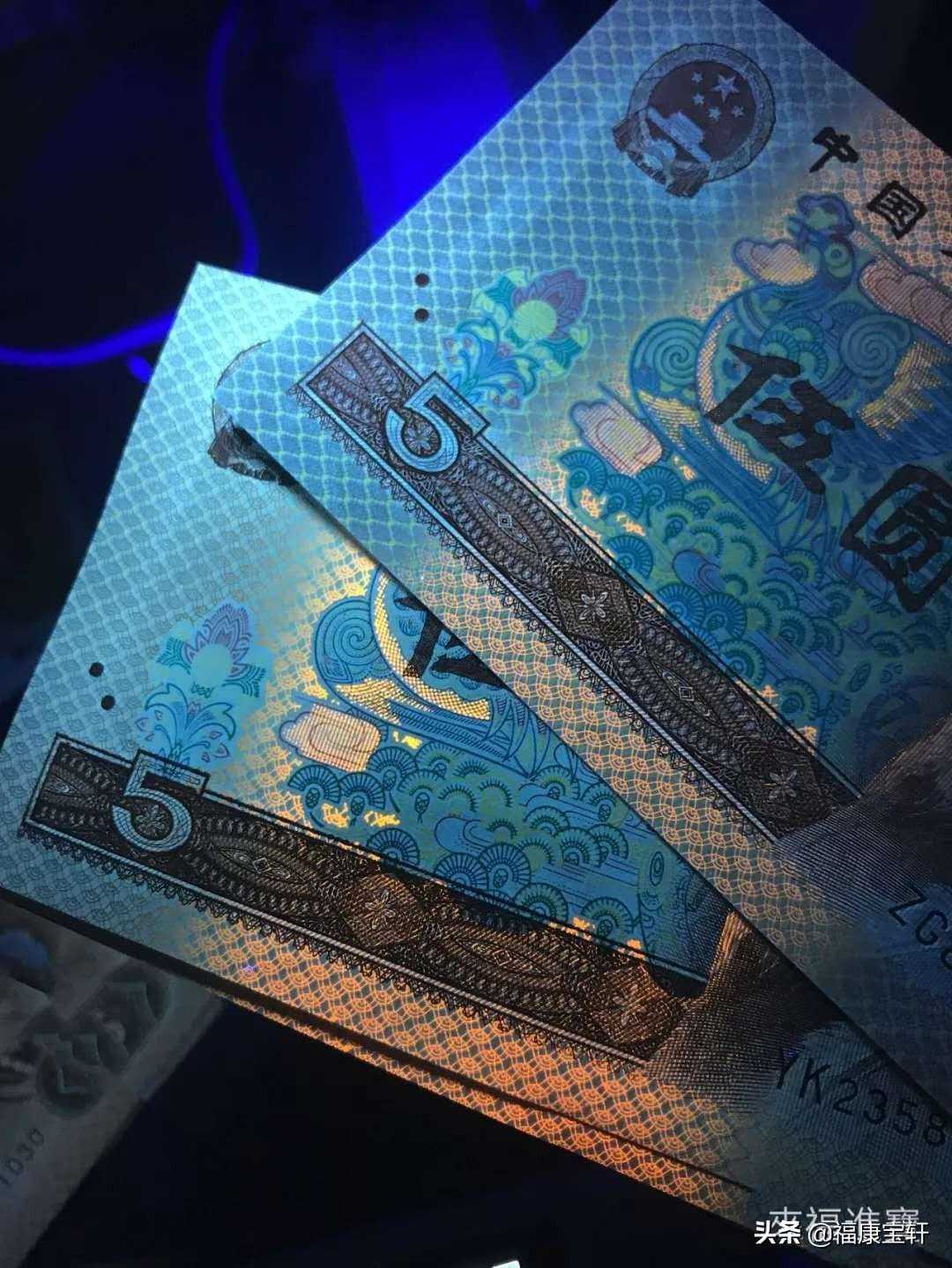 1、绿苍松:其票面在紫光灯的照耀下,会呈现出翠绿色,翠鹤由红,蓝,绿三色组成。鸟冠和口中叼着的祥云,呈现红色荧光反应,右侧少数民族女人头部后方半圆图案内同样有荧光;纸币背面左侧几何图形内有翡翠绿,右侧花的叶子和花朵分别有绿色和红色荧光。并且绿苍松无法用冠号和流水号段来精确锁定,必须通过荧光灯来检验判断。