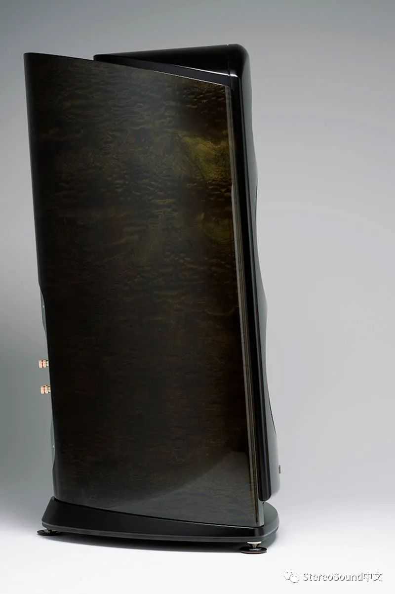 为了使系统整体的重心最优化,前面板向后倾斜了4度,CST驱动器正对聆听者安装。声箱内部框架用桦木胶合板制造,外壳是MDF制。侧板贴有花斑纹沙比利的刨切单板,准备了墨玉绿和绿柱石红2种颜色的外饰。