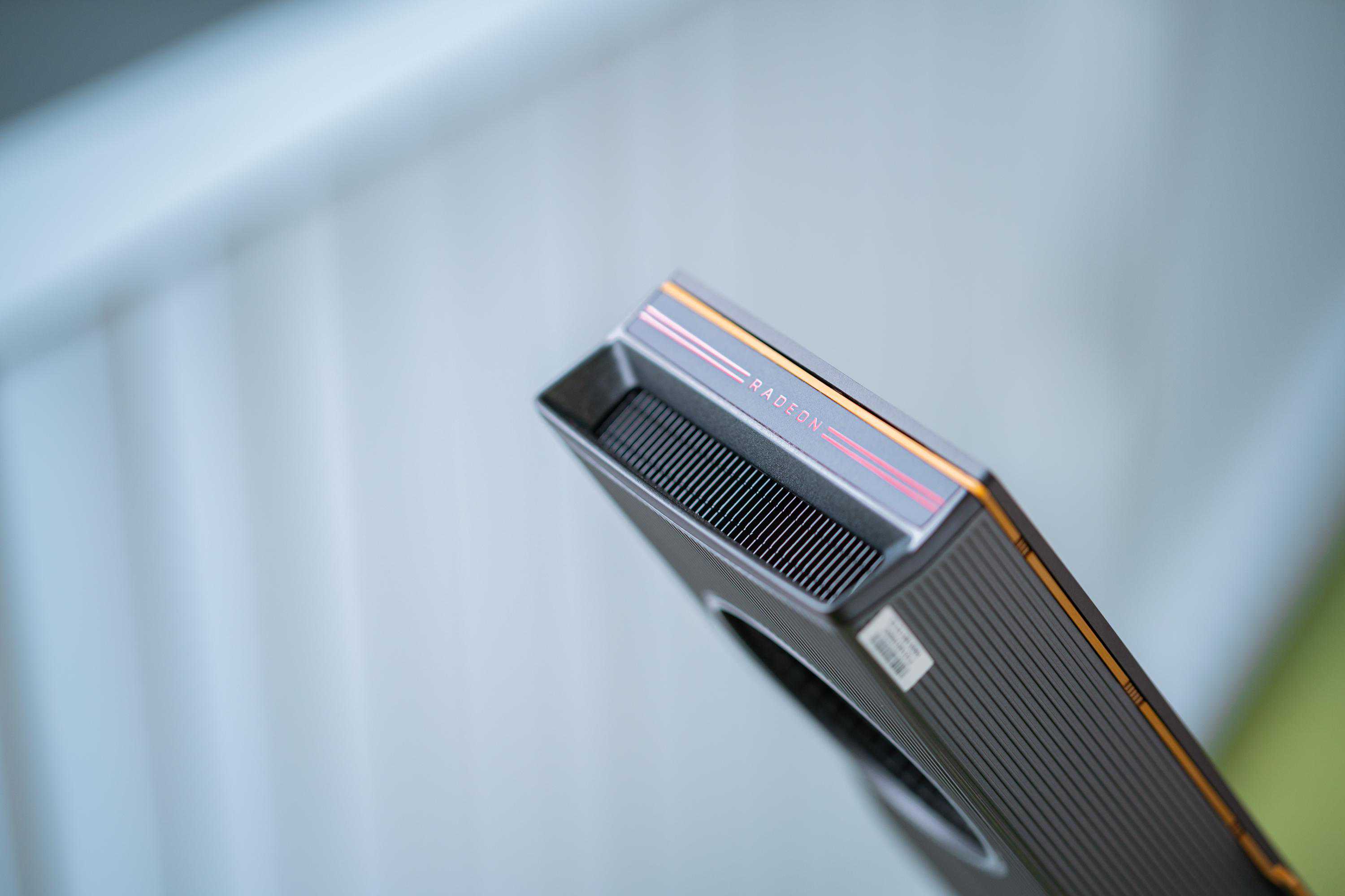 公版5700XT采用涡轮散热设计,外观相较于方方正正的5700显得很有质感,材质虽然都是铝合金,但是表面的RadeonLogo和线条处理,加上苏妈亲手捏出来的凹陷,再搭配顶端的红色信仰灯,可以说这款卡满载着A粉的信仰。