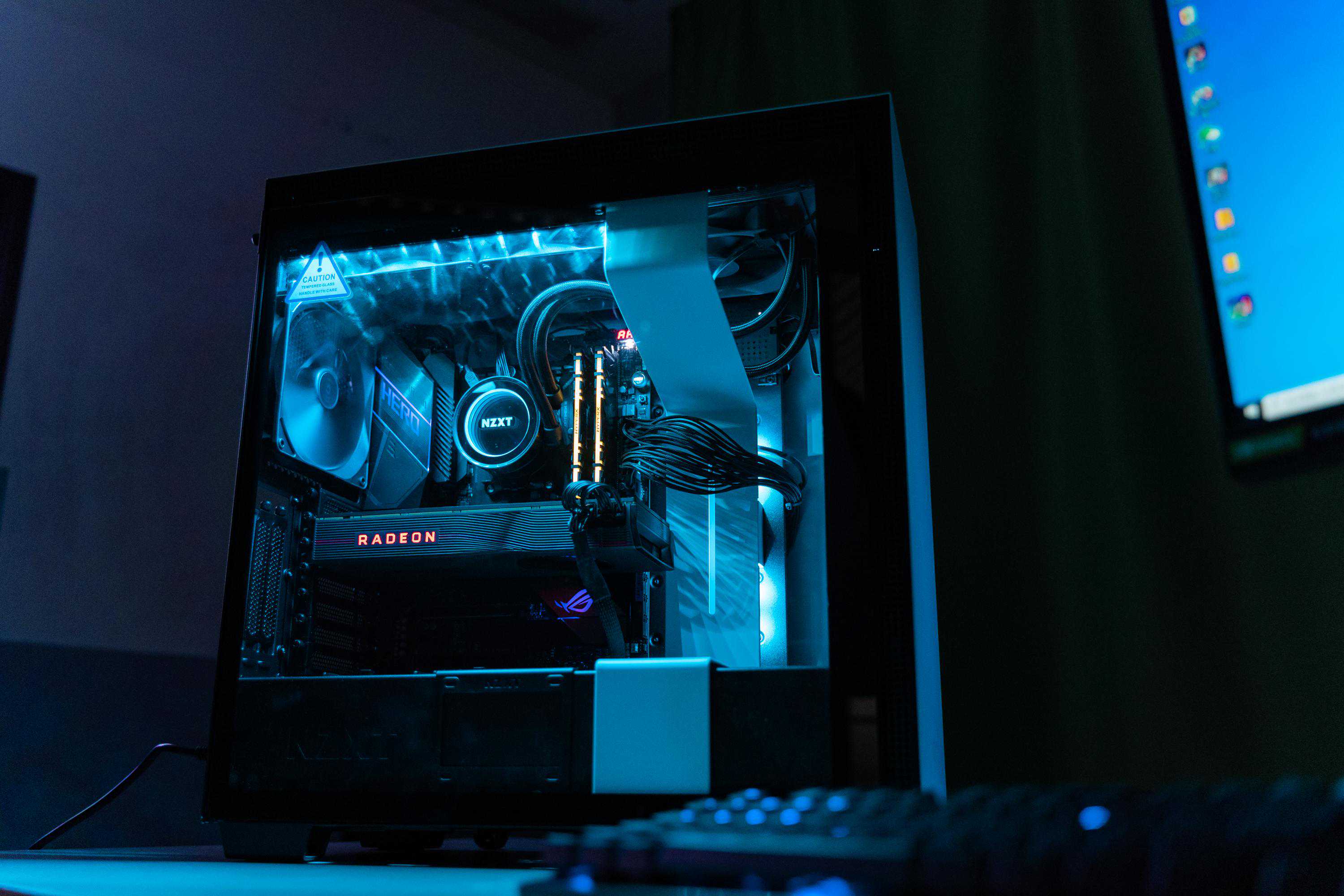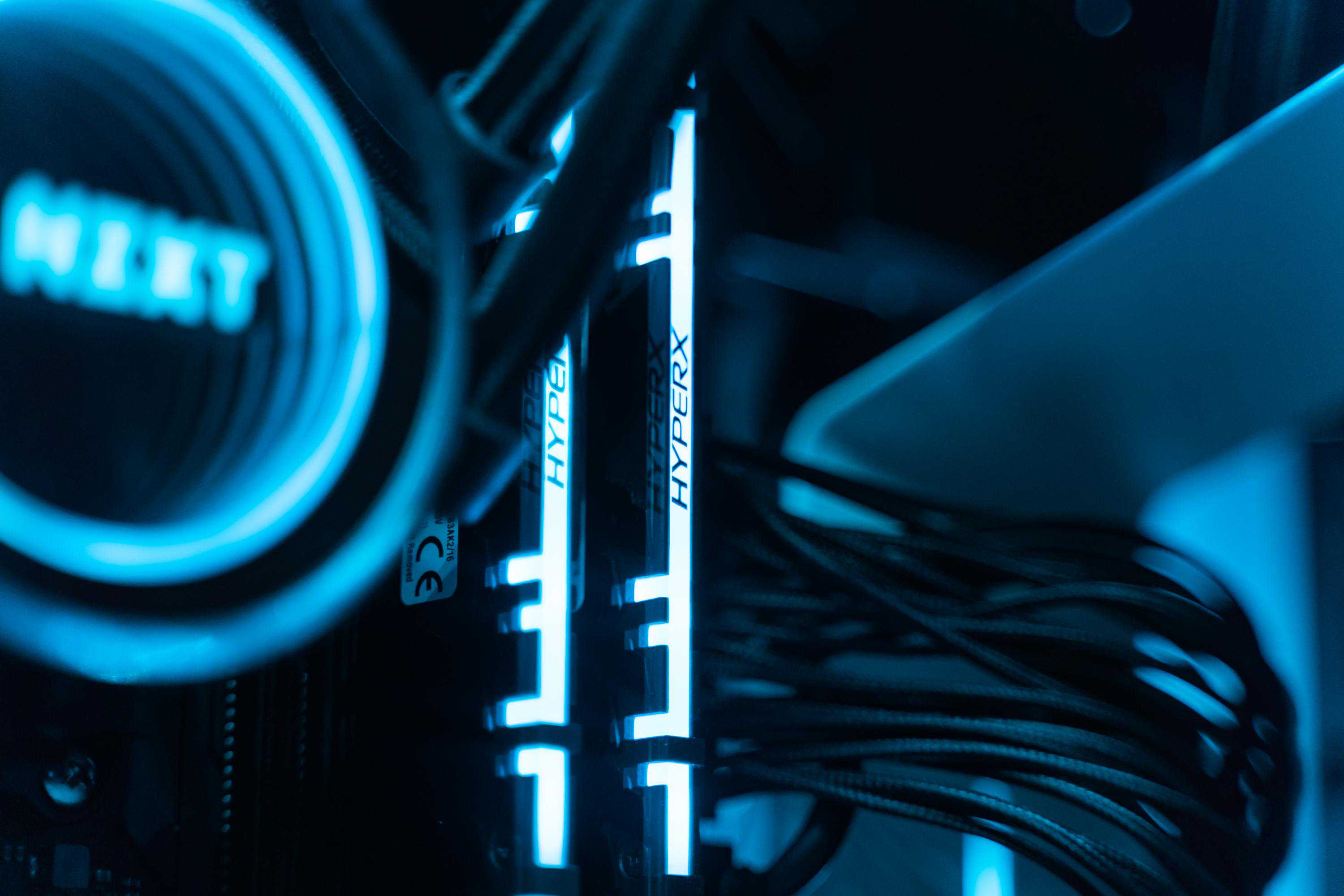 通过这个角度基本可以看到本次攒机的所有发光部位(除了电源):H710i机箱自带的LED灯条、x72冷头、HyperXpredator内存、C8H的I/O散热装甲及南桥散热,还有Radeon红色信仰灯,其实除了显卡信仰灯都是RGB的,不过我是不喜欢跑马灯光污染的,就全部调成了青色,在黑暗中显得深邃幽静——只有那一抹醒目的红色信仰。