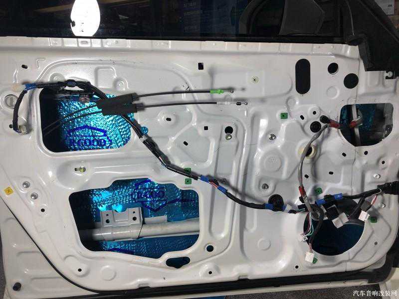 首先用蓝卫士隔音材料对四门进行隔音降噪处理,对汽车的门板做了双层的隔音处理,就像为声场喇叭制作了一个密封的箱体,从而有效的减少风噪对音响效果的干扰。