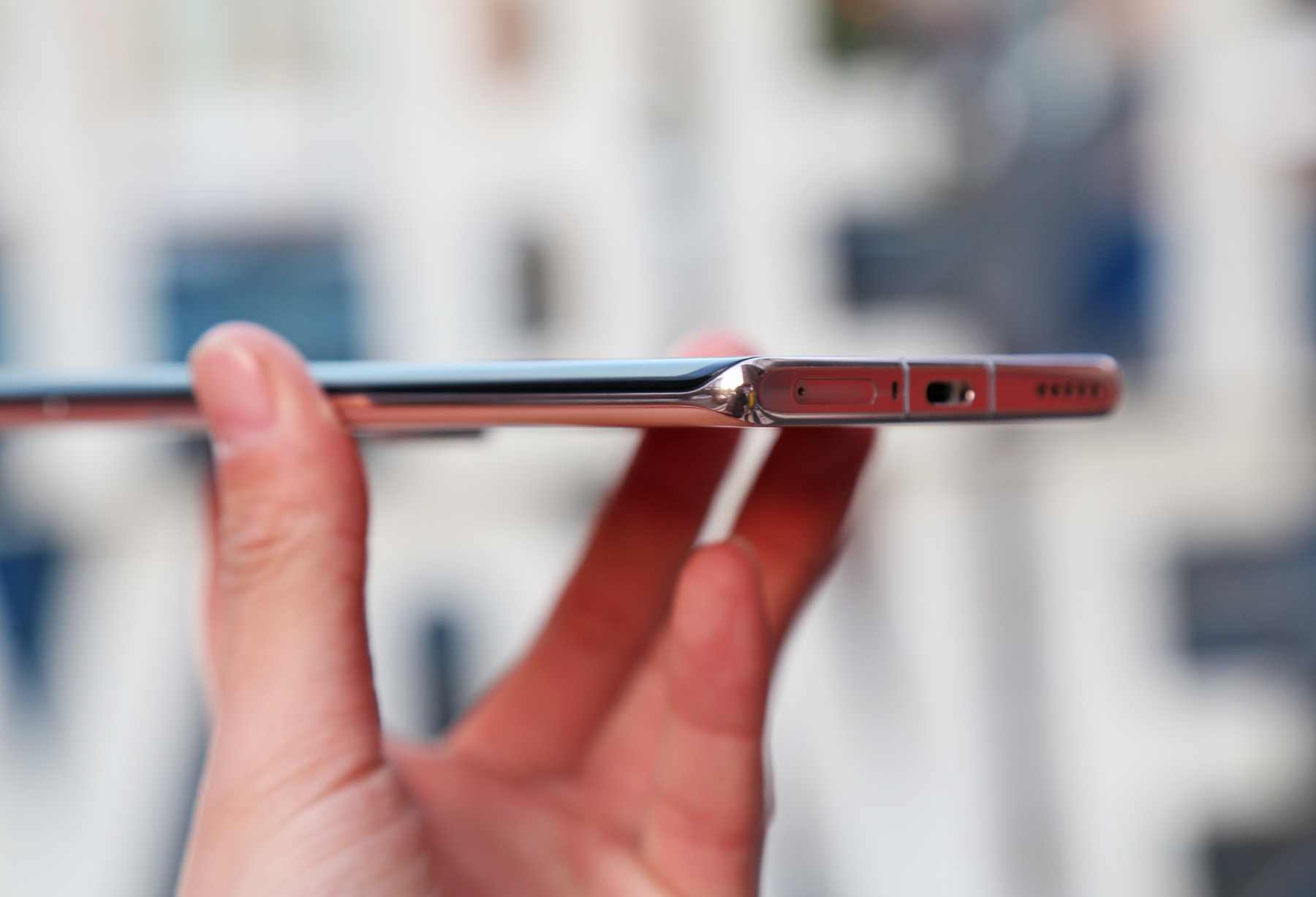 正面可能不太明显,但将视角转到侧面可以清楚看到,实际上它的屏幕两侧与中框连接处,设置有和上边框几乎等宽的黑边,同时由于屏幕边缘伴有一定倾角,握持手机时,手指并不容易直接接触到屏幕有效触控区域,所以大可不必担心会因为误触而影响到正常使用体验。