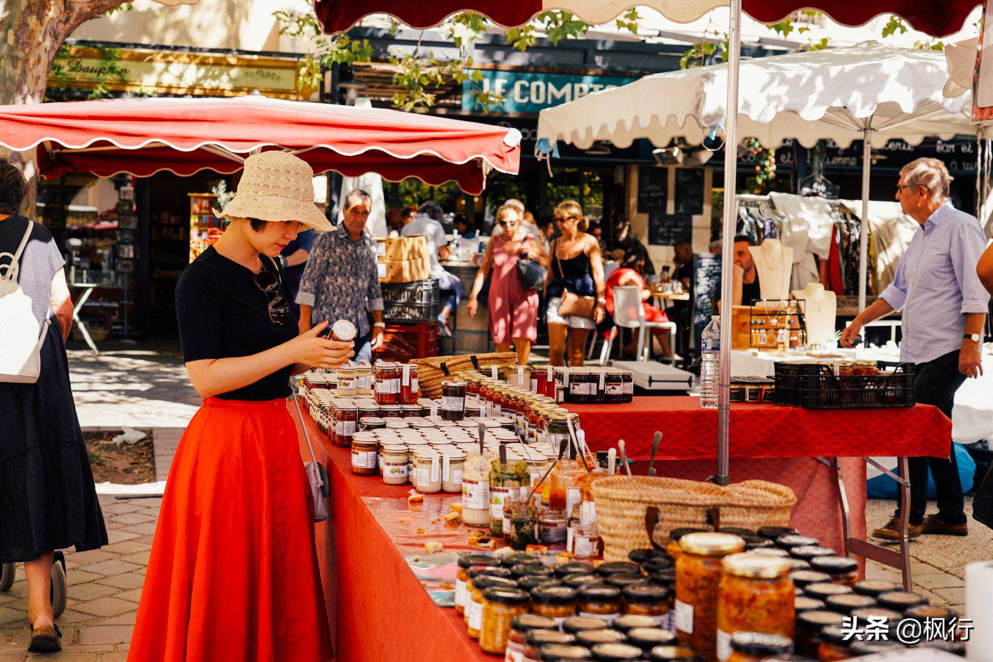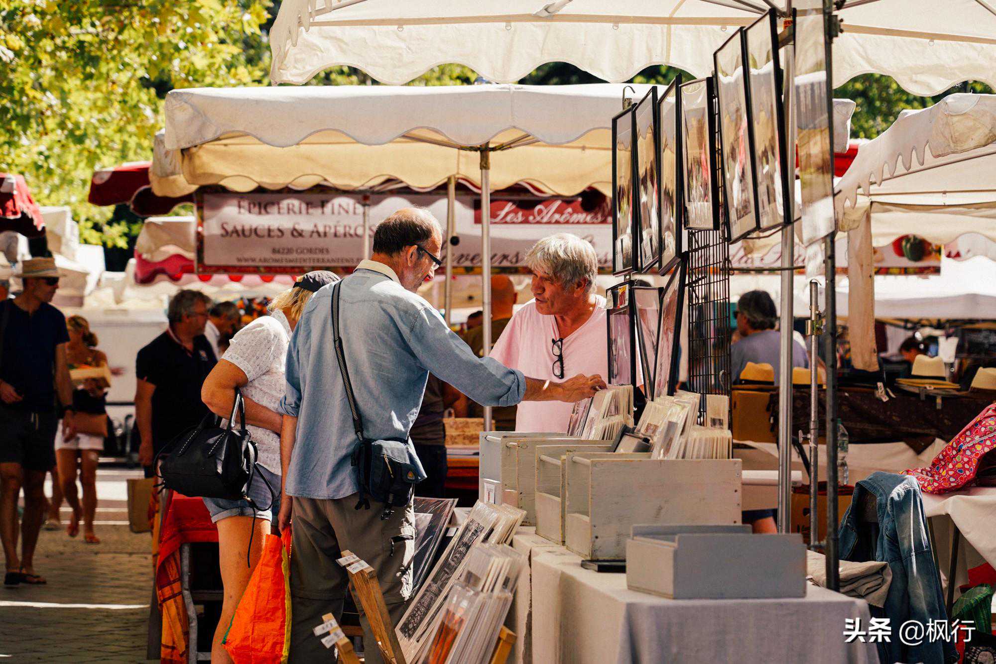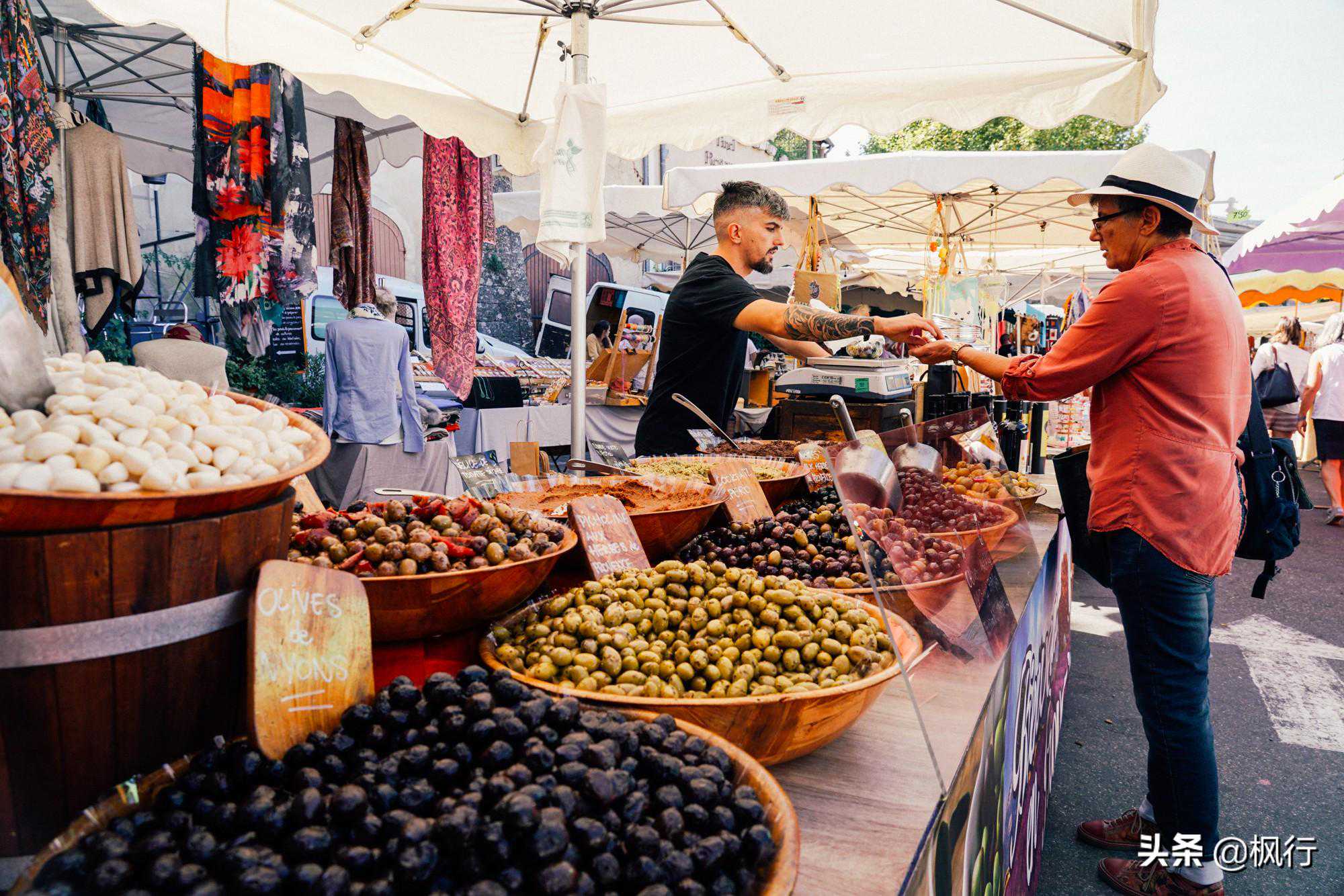 恰逢周五,小镇山脚下平坦的道路上,聚集了很多市集摊位。出售在普罗旺斯最最普通的商品,香肠、橄榄、奶酪、丝巾。