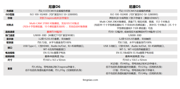 尼康D6和D5参数对比表