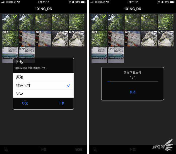 照片下载品质选择(左)和下载文件状态(右)