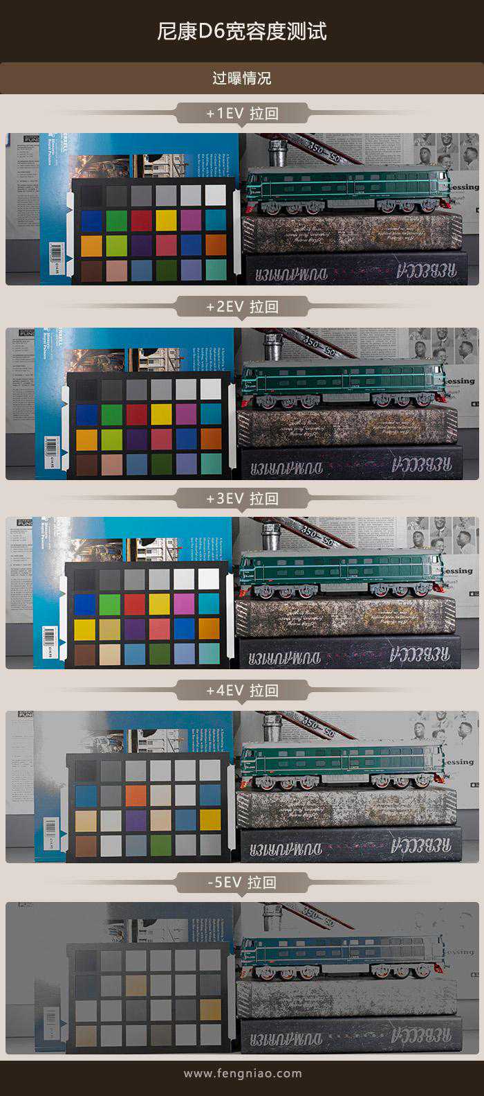 从上面的截图来看,尼康D6在欠曝3档拉回后,仅在暗部细节出现了一定的噪点,但整体还是非常可以接受的,欠曝4档拉回后噪点进一步增加,且有轻微的色彩断层情况。而在过曝方面,过曝3档后再拉回曝光时后高光部分细节丢失,且出现了偏色的现象。总的来看,尼康D6在欠曝3档、过曝2档范围内提供了相对充足的后期处理空间。