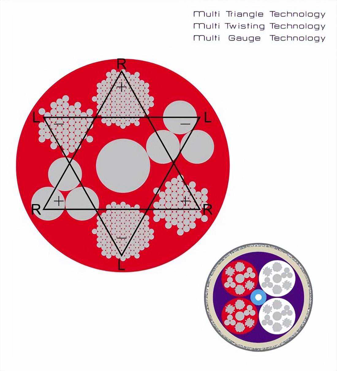 由于每一条线材内设计布置了各种导体线径,所以需要设计出不同的绞绕角度,这对于制作机器来说具有相当大的难度,其技术和技巧不言而喻;平衡技术(MultiTriangleTechnology):为了获得最佳的信号传输和最佳的声音平衡度,制线过程必须达到每条线之间的各股导体都是完全对称,也就是说,不仅导体绞绕的方向分为正向和反向,而且正向和反向的每股导体也一定要完全对称。