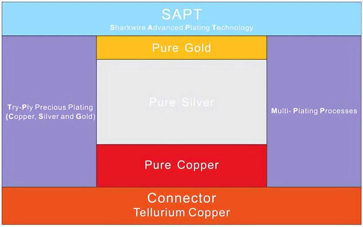 英国鲨鱼SharkWire独家技术SAPT(先进电镀技术)使用碲铜作为基底,然后镀上一层纯铜、一层更厚的纯银,再加上一层纯金。通过如此复杂工序的多层次电镀,其目的是使导线结合不同金属材质的声音特性,发挥出更好的传输性能,展示出更完美的声音表现。