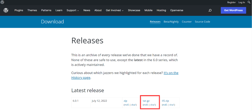 进入WordPress官网的下载页面(),下载格式的软件包至本地。