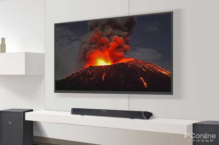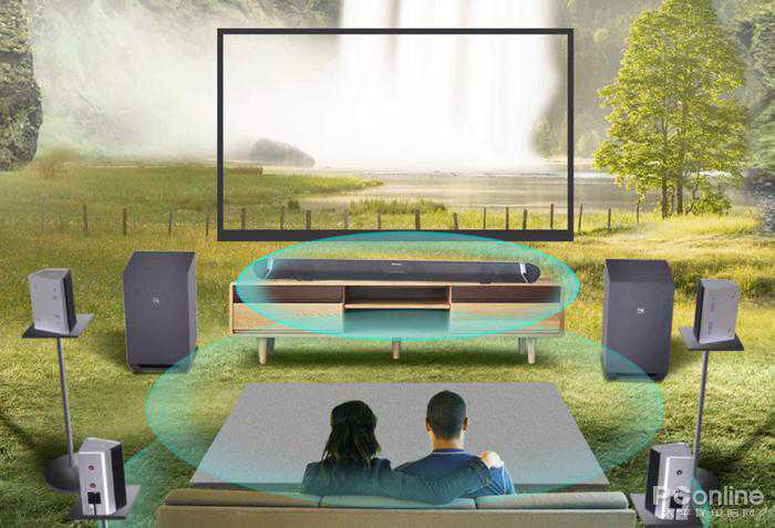 首先,最扎眼的莫过于长条形的SoundBar,放在电视的前面更是成为提升整屋格调品位的点睛之笔。而这SoundBar虽然身材苗条,其实内置六个2.5英寸的全频喇叭和两个1英寸的高频喇叭,威力不容小觑。