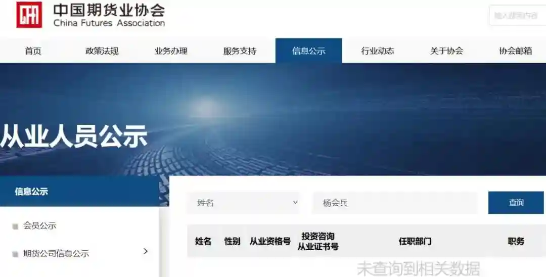 陆金办通过中国期货业协会查询,截至目前,杨会兵和王烨未在渤海期货任职了,也不在任何一家期货公司任职。