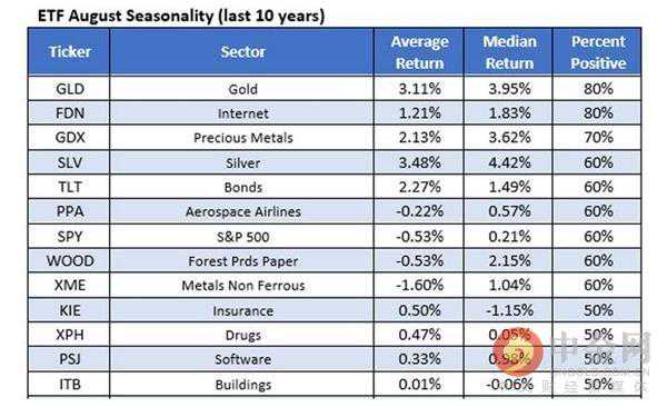 过去十年,8月表现最佳的13支ETF中,有五支是大宗商品基金或有大宗商品敞口的股票基金。