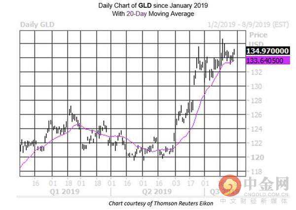 外汇天眼指出,根据Schaeffer的投资研究,在过去十年中,GLD有80%时间在8月份收涨,平均涨幅为3.1%。从2009年到2018年,GLD有八次在8月份上涨。