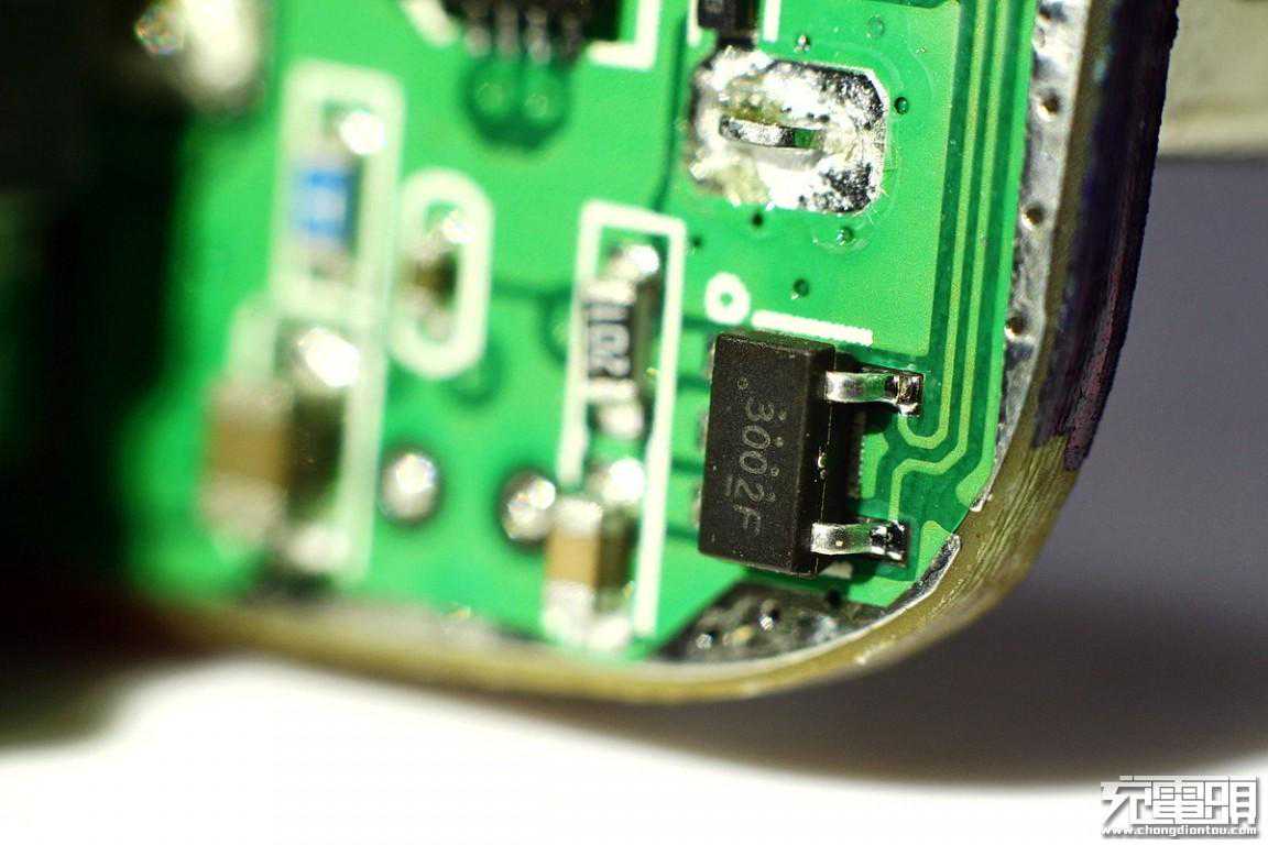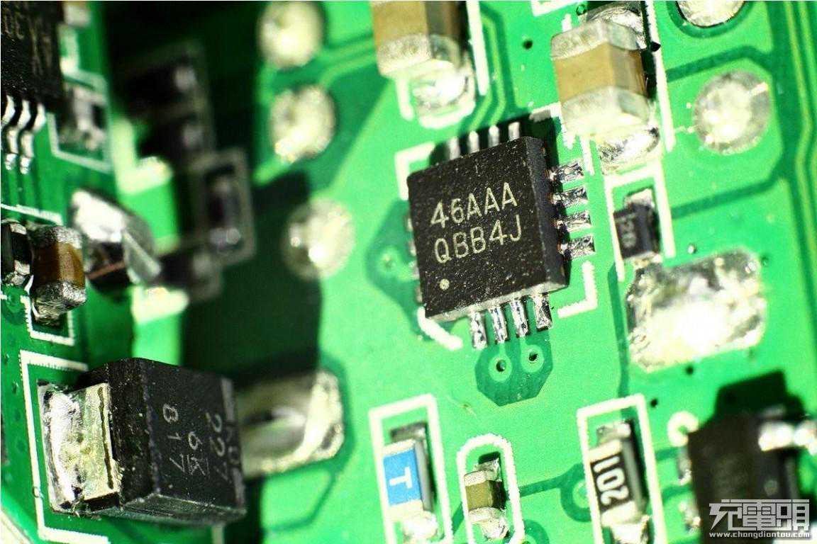 丝印46AAAQBB4J为cellwise赛微CW3046。该芯片具备识别限流功能,还可以设置USB的模式、SDP、CDP、DCP、SMARTCHARGE、并可以和主机通讯。下方蓝色贴片元件是一颗保险丝,增加一道安全防线。