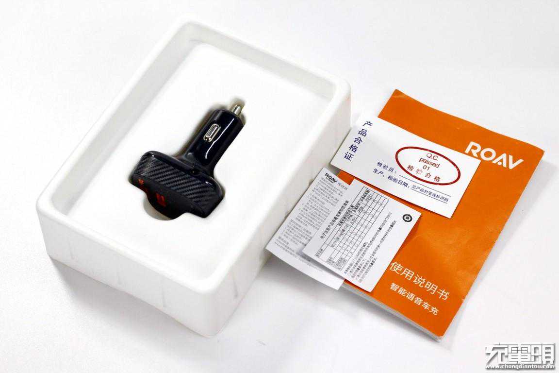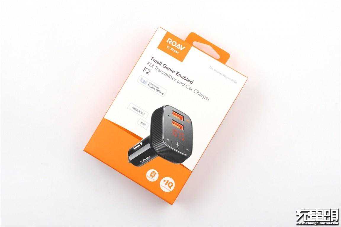 RoavF2车充外包装正面彩印了产品实图,旁边的一组对话框与天猫精图案,让我们很容易就能联想到这款车充支持语音控制,右下角有蓝牙4.2与PowerIQ充电技术的图标,代表这款车载充电器支持蓝牙连接与PowerIQ充电技术。