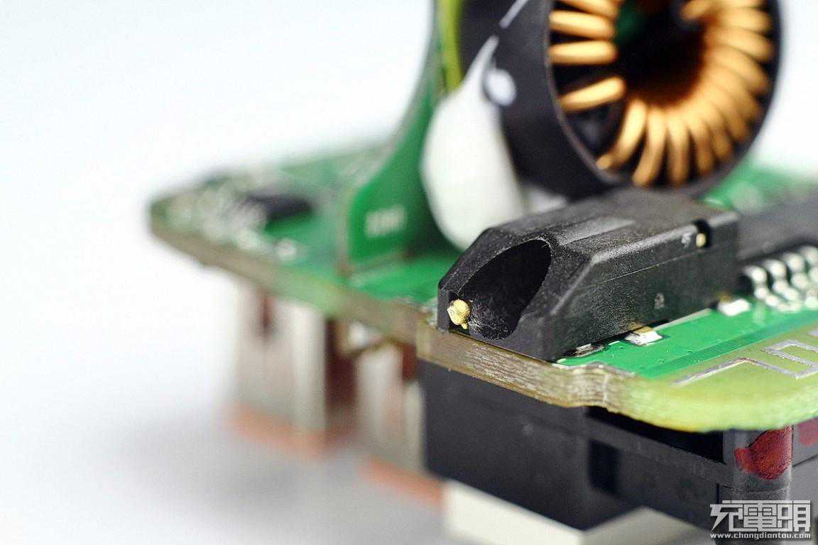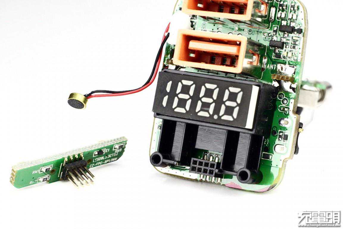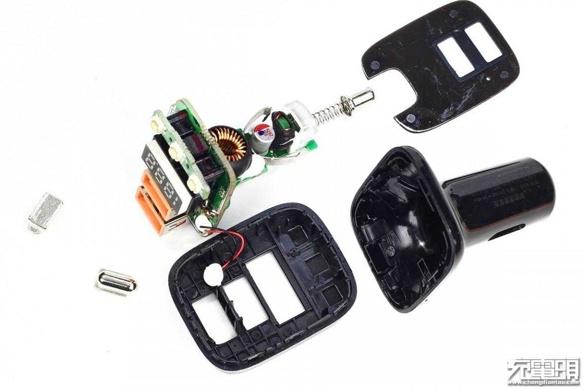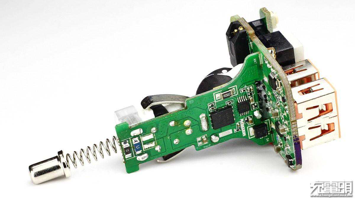 非常迅速地将车充拆开,产品的组件还算比较简单,只是内部PCBA结构比一般车充稍微复杂一些。