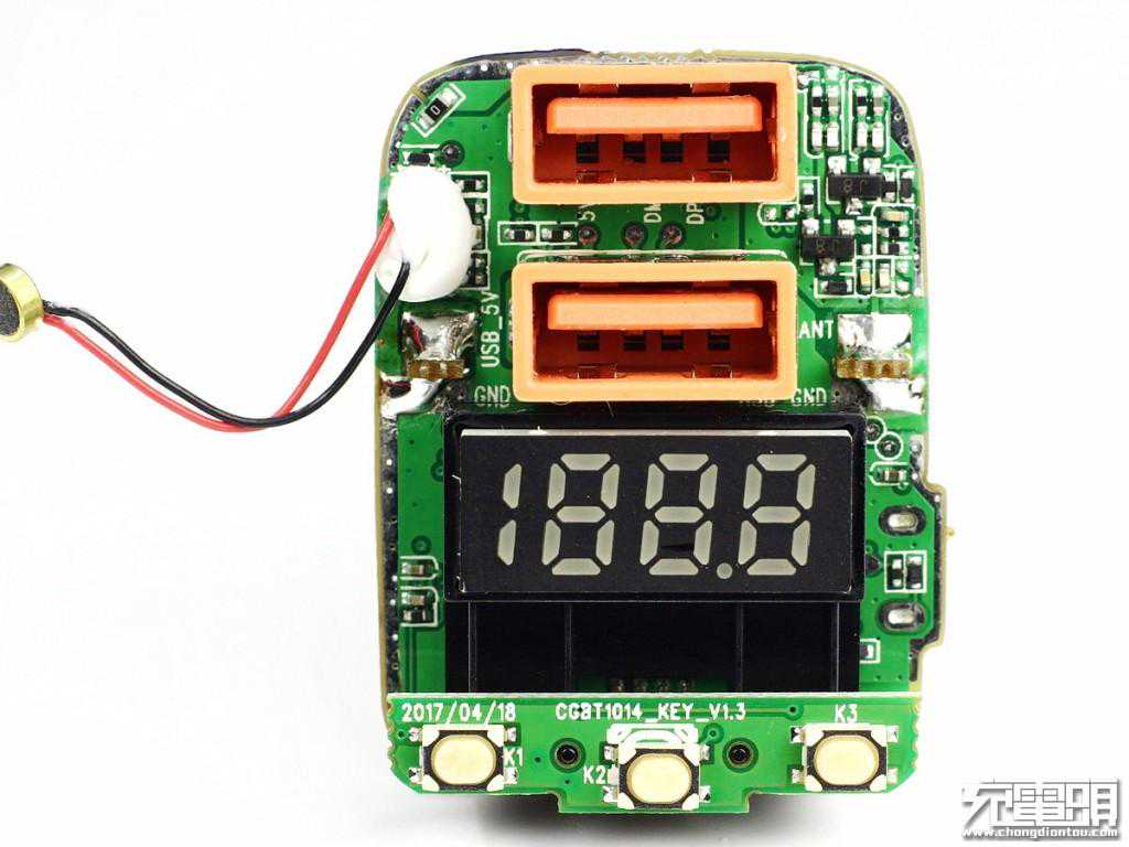 双USB-A接口下面是一块四位数显屏幕,最下面是三个贴片按键开关。
