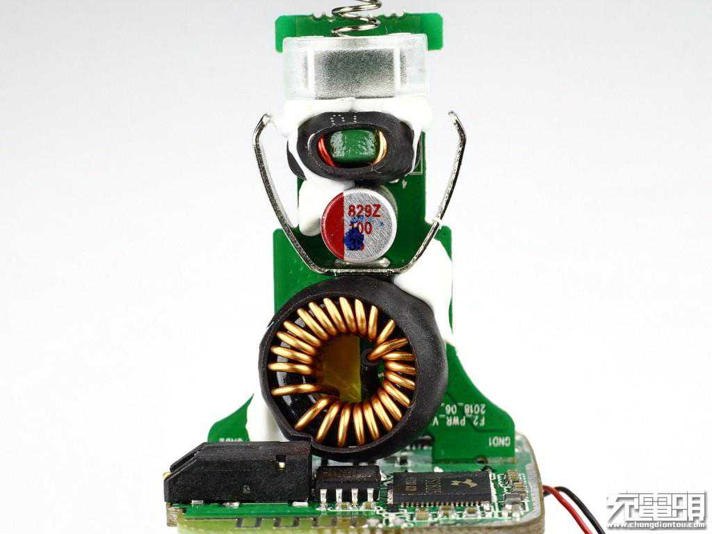 两块主控PCB板呈“T”型焊接在一起,正极没有飞线,直接使用弹簧导通,PCB板上有多颗芯片。