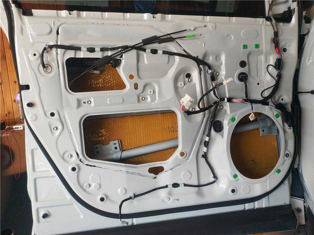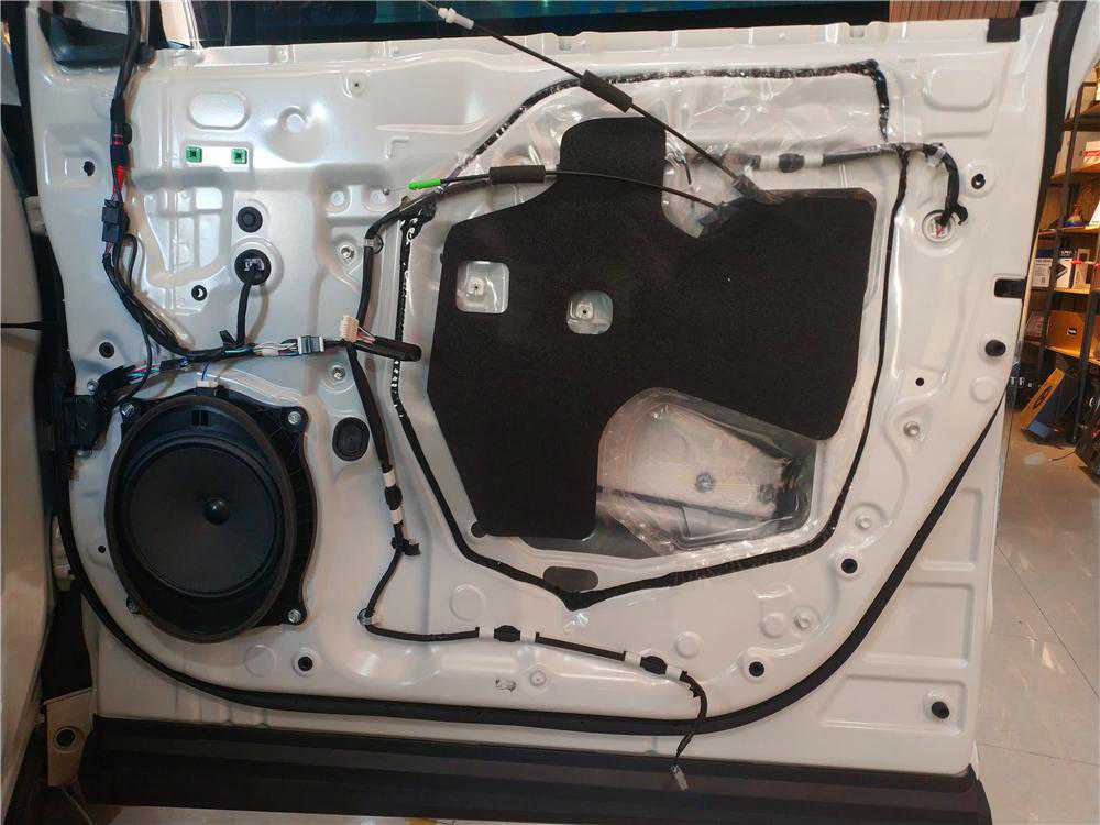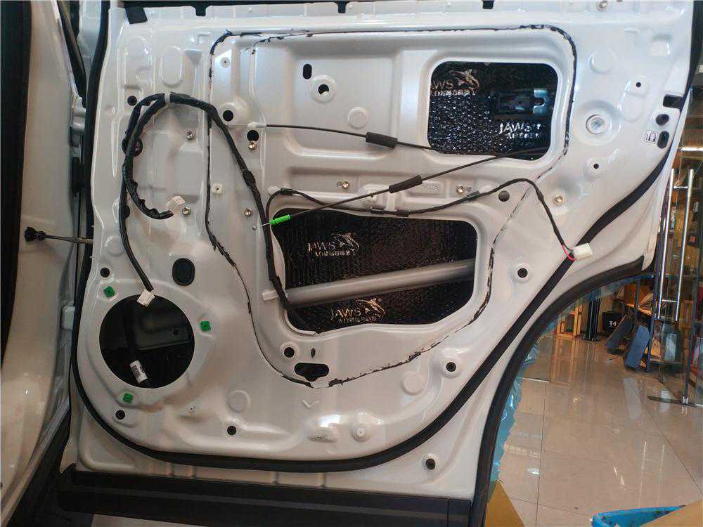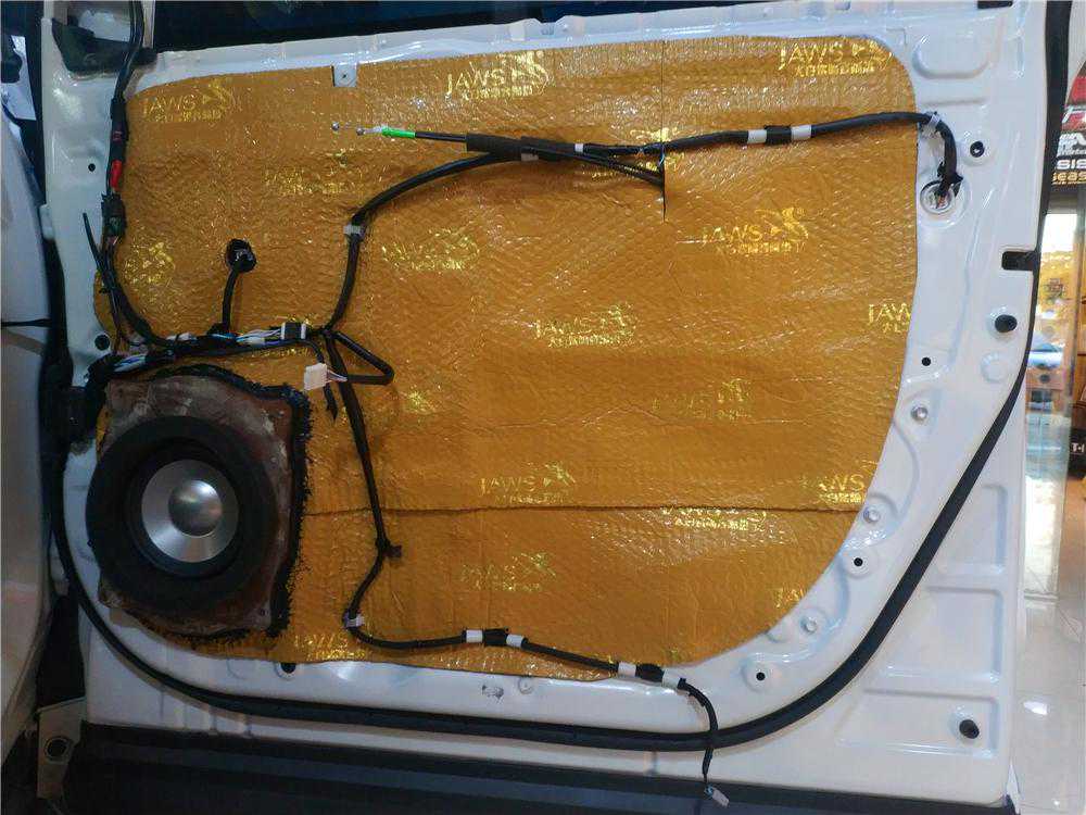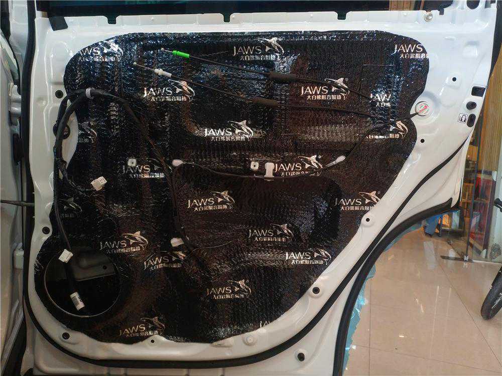 前门使用的是大白鲨金鲨隔音材料,厚度相对于银鲨厚所以隔音效果会更好。后门则使用的是银鲨隔音材料进行施工。