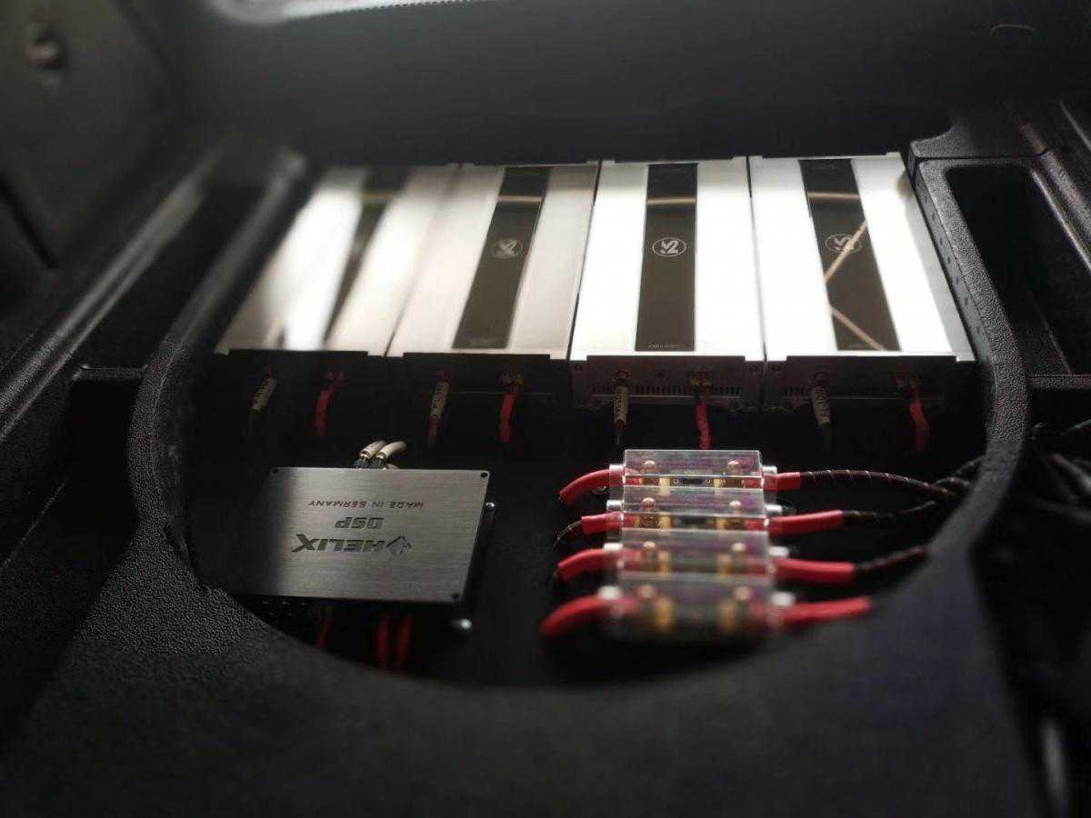 四台奥地利卡杜175.1功放,每台功放单独配备的保险座以及音频处理器,安装在尾箱盖板下方。简洁大方的同时,不占用尾箱任何空间。
