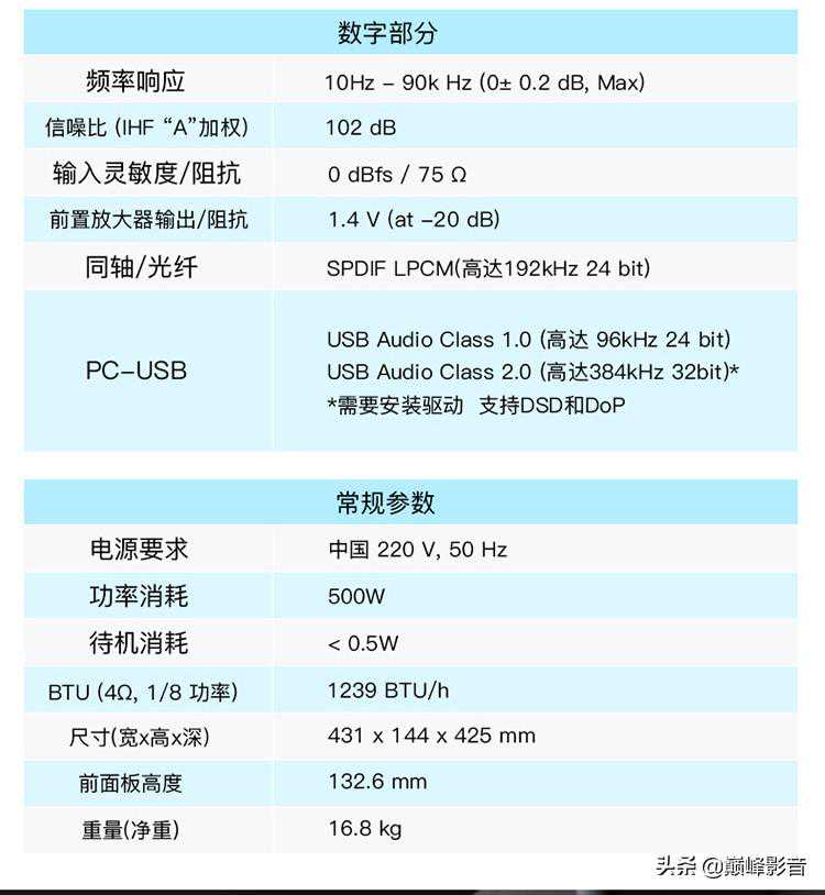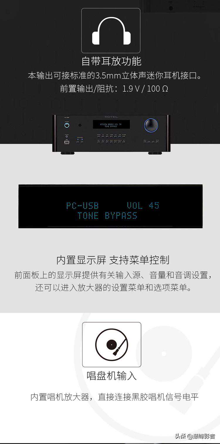 功放部分,RA-1592结合卓越的32位768kHzAKM数模转换器(DAC)和超高音质的模拟电路。该DAC和周边的电路支持众多输入源,包括带PC-USB(24位/192kHz)的DSD、3个同轴、3个光纤、集成aptX®蓝牙和前面板USB的iPod输入。为了忠实的模拟音乐爱好者,还设置了唱机输入(MM)、平衡XLR输入和4个非平衡RCA输入。