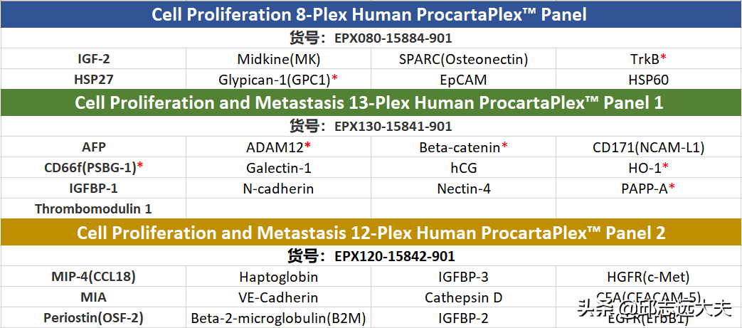 癌症研究中对肿瘤标记物尤其是蛋白的检测是最为重要的研究领域之一,在科学家寻求检测新的癌症标记物时,对于样本量和检测指标的考量成为选择检测方法的重要指南。赛默飞作为全球生命科学领域的领头军,ProcartaPlex多因子试剂盒可以通过少量样本同时检测高达65种靶标蛋白,为肿瘤标记物筛选及药物开发、临床检测提供了非常方便快捷的检测手段。基于前期大量的科学数据及文献报道,ProcartaPlex引入了涉及免疫肿瘤、血管生成、细胞凋亡、癌症转移、细胞增殖、细胞死亡和外泌体等特性的标记物,为癌症生物标记物分析提供了一个非常完整的解决方案。针对于两位教授提出的“肿瘤十宗罪”(肿瘤十大特征参数,2011年提出的第二版本)赛默飞提供相对应的ProcartaPlex多因子检测试剂,除了市面上常规常见的靶标蛋白以外,基于赛默飞非常专业的抗体制备技术,赛默飞推出了ProcartaPlex多因子试剂盒独家的肿瘤检测靶点,为癌症的研究提供了独特的研究方案,下面我们会对试剂盒中独特的蛋白靶点进行详细的解读。