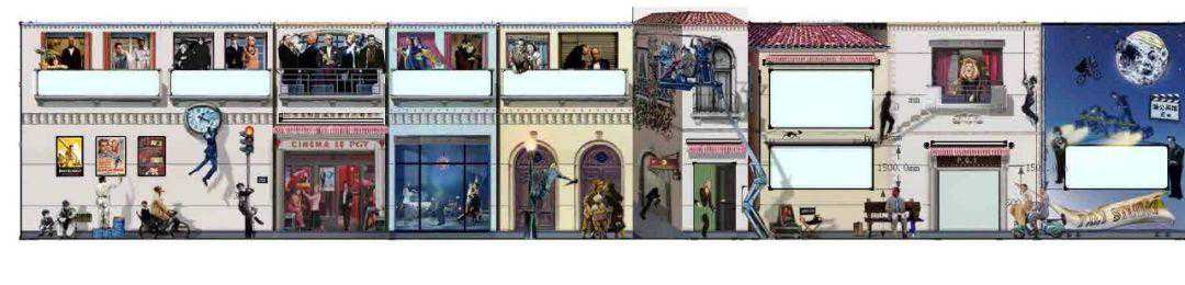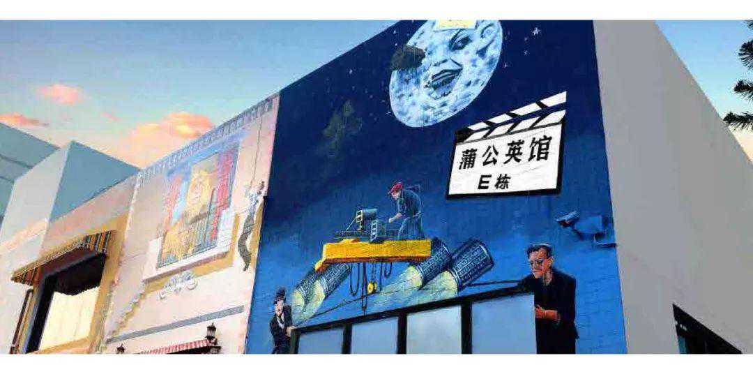 蒲公英电影文化主体墙绘:把一副形象、有趣的电影文化图卷展现给大众,对电影史上那些如星光宝石般闪烁的人物、作品进行时空编织,传递电影世界的魅力。墙绘尺寸40290*7400mm,面积达300平方,共35组元素,52个独立人物、涉及30部经典电影作品。墙绘内容与建筑本体巧妙融合,绘制的门窗与真实门窗交叠,形成有趣的视错觉,进出之间仿佛穿越奇妙的电影世界。